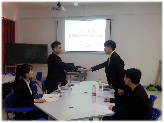 2018年1月5日,山东华宇工学院首届模拟商务谈判竞赛在20号楼719室商务谈判模拟实验室成功举行。本次竞赛是我校市场营销协会因应大学生社团科技文化节而举办的活动之一,得到了校学生处、校团委、365best体育亚洲官网以及相关部门的领导、老师及同学们的关心和支持。