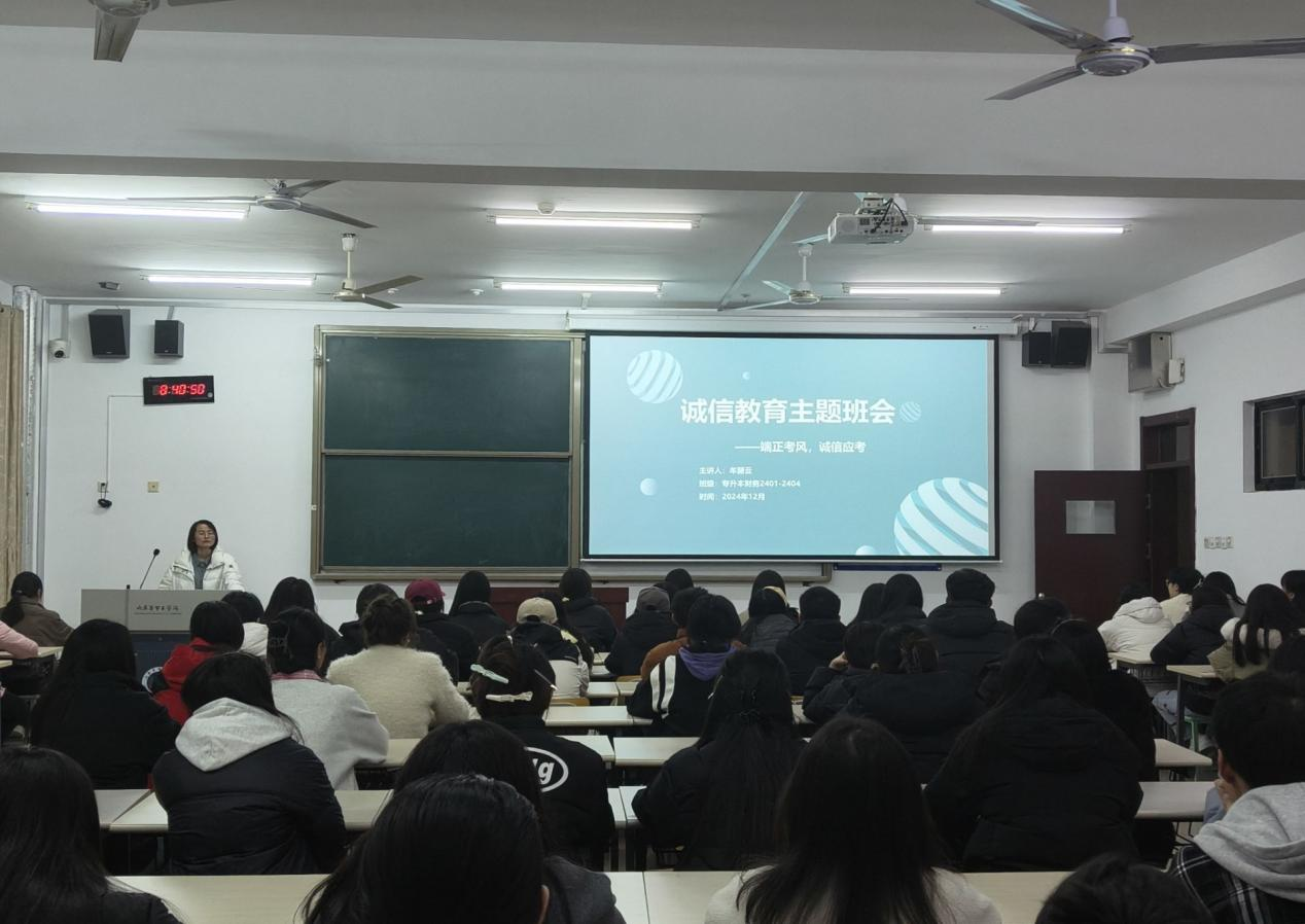 各班会上,辅导员老师向学生传达了考试规则和强调了考试纪律,告知学生要遵守学校规章制度,以认真严谨的态度面对即将到来的期末考试。辅导员老师们从考试规则解读、作弊行为剖析、诚信品德树立、学业生涯影响等多个角度,深入透彻地讲解与真实典型的案例呈现,让学生们深切领悟到诚信应考的重要性,有力地提升了学生的诚信应考意识,为学生们构建起一道严密坚实的思想防线,同时也为学生们的学业进步与个人成长提供保障,使他们能够在公平公正的环境中自信应考、砥砺前行。