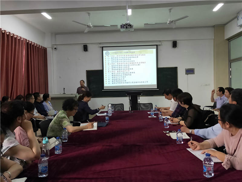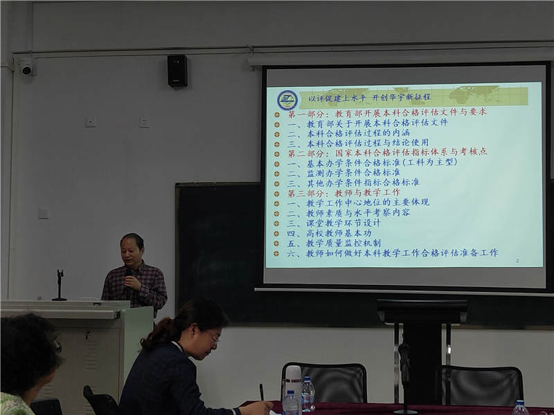 会上,尹子民教授深入浅出的解读了教育部关于开展本科合格评估的文件,简要阐述了本科合格评估的过程以及结论的运用,在此基础上,详细介绍了国家本科评估指标体系及考核点。随后,尹教授重点讲述了教师与教学工作在本科评估工作中的重要地位及作用,就教师如何做好本科教学工作合格评估准备工作进行了探讨。他指出,做好以评促建工作,学院要在以下五个方面下足功夫:一是要体现教学工作的中心地位;二是要加强教师的素质和水平;三是要督促教师好课堂教学各环节设计;四是要扎实推进教师教学基本功训练;五是要完善教学质量监控机制。