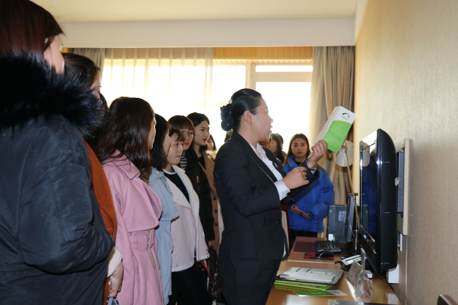 太阳谷微排国际酒店是世界首家太阳能“微排”大型商务会议酒店。酒店内部装饰豪华典雅,设施齐全,环境优雅,功能齐备,集客房、餐饮、会议、康乐于一体综合性酒店。酒店客房部经理接待学生参观了前厅、客房、餐厅和康乐等部门,并为学生介绍各部门的岗位职责及操作规范。在客房部,李经理为学生详细介绍了客房内部布局及设备使用,带领学生参观了该酒店的标准双人间、商务套房、婚庆主题房等。