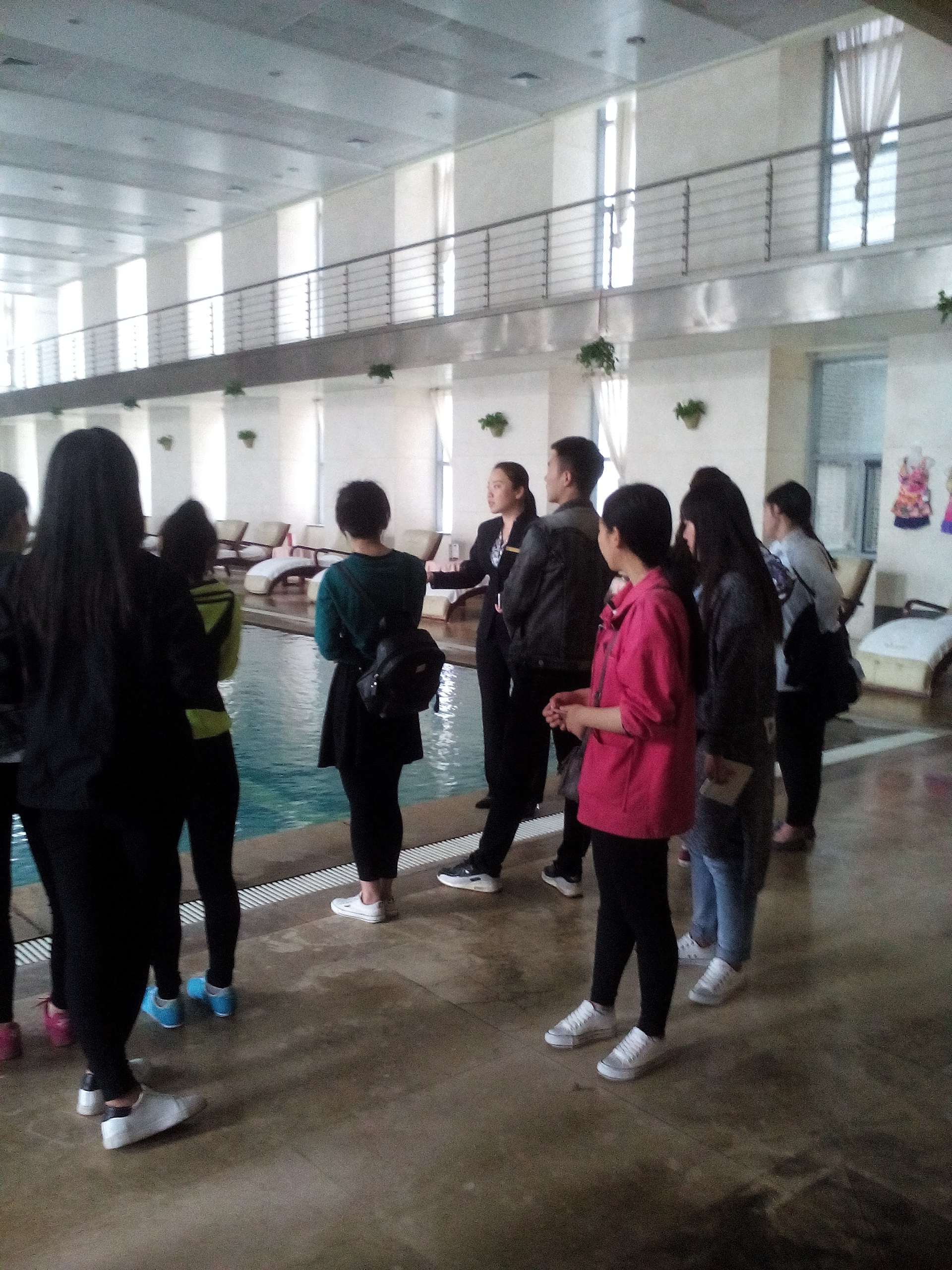 酒店的康体中心位于酒店副楼。该楼共四层,设有恒温温泉游泳池,室内网球馆,台球室,乒乓球室,室内高尔夫练习场,健身房,棋牌室等。学生进入康体中心,参观了这里的总体布局和设施设备。