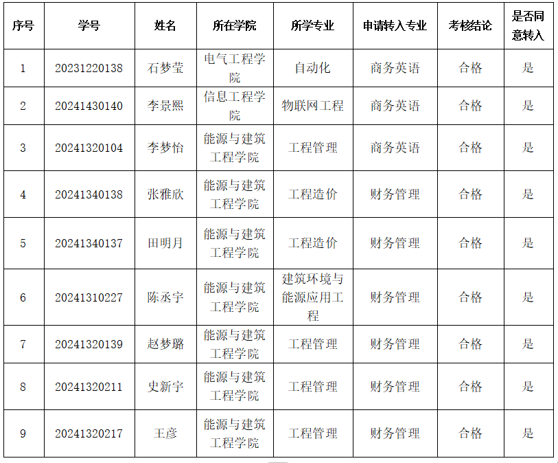根据《山东华宇工学院关于做好学生转专业工作的通知》的相关要求与规定,经学生申请、学院审核、教务处复核、学院考核,拟接收转专业学生9名。现将名单予以公示,公示期为2025年5月19日—5月21日。