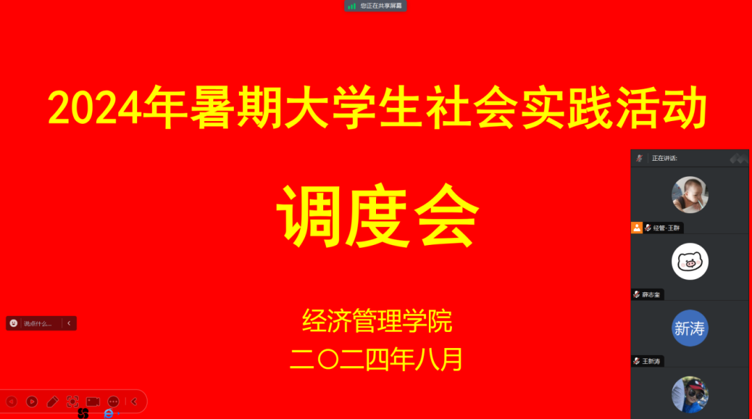 为深入掌握365best暑期大学生社会实践活动的开展情况,详细了解实践活动过程中存在的困难和问题,扎实推进365best社会实践工作顺利进行,8月6日上午,365best通过腾讯会议的形式线上组织召开了2024年暑期大学生社会实践活动开展情况调度会。本次会议由团总支书记王群主持,党总支书记、副院长范世伟以及各团队社会实践指导教师参加了此次会议。