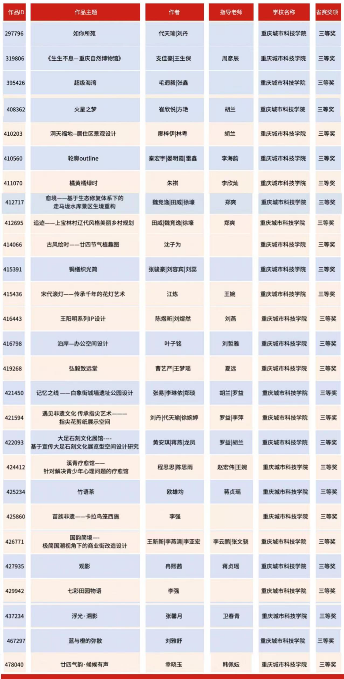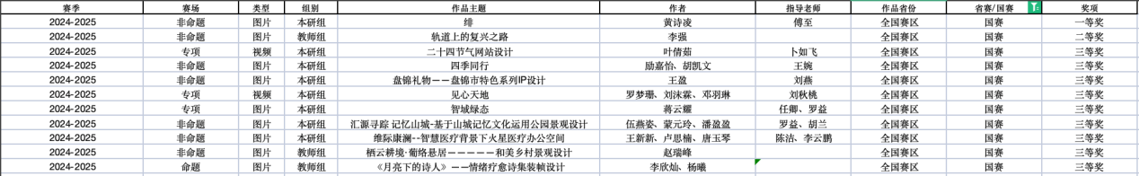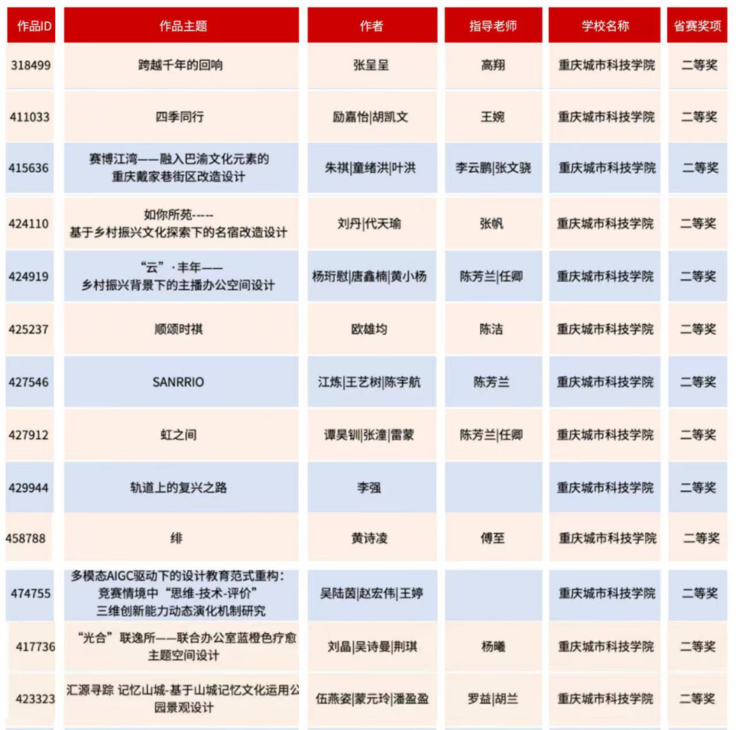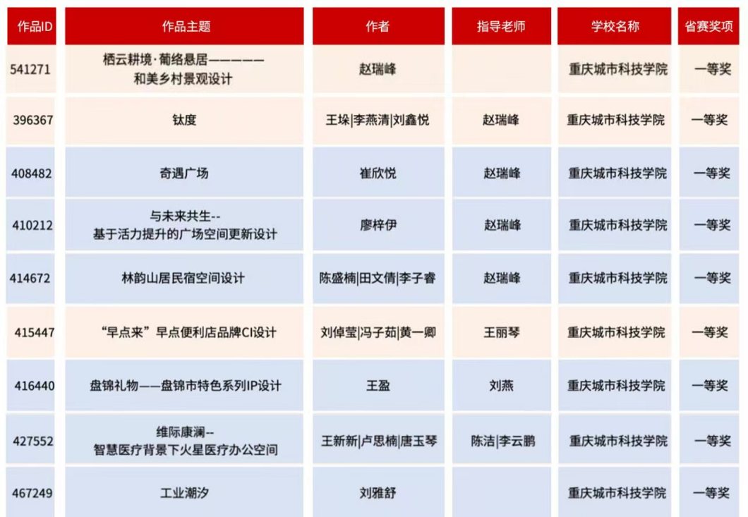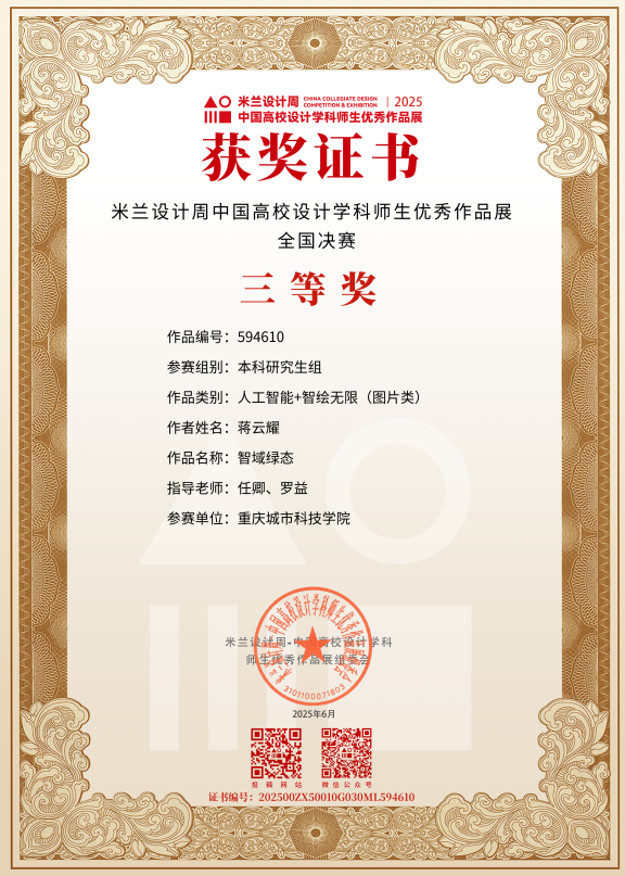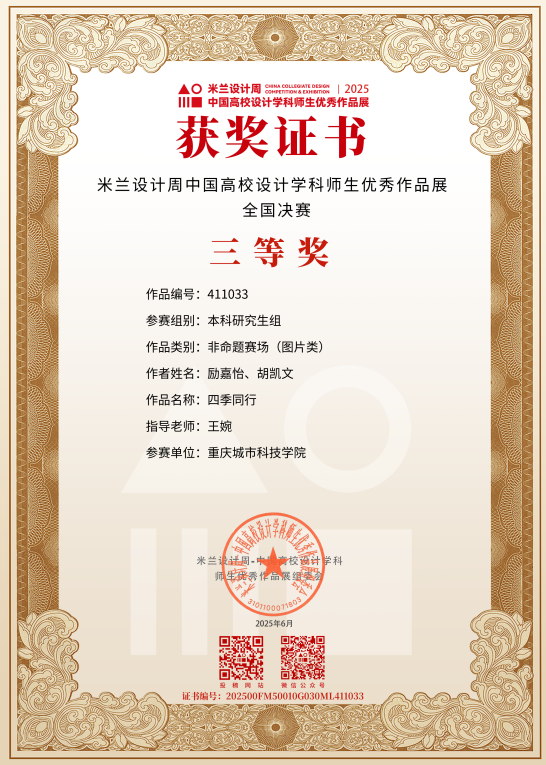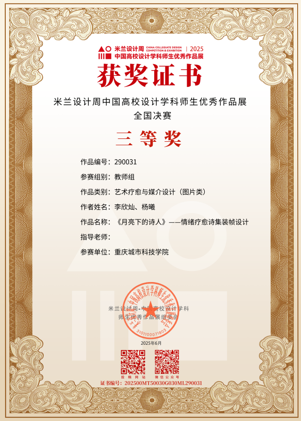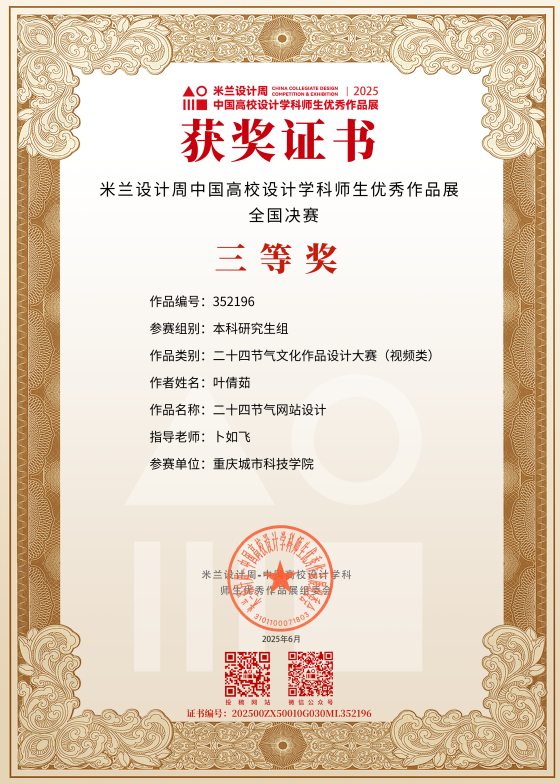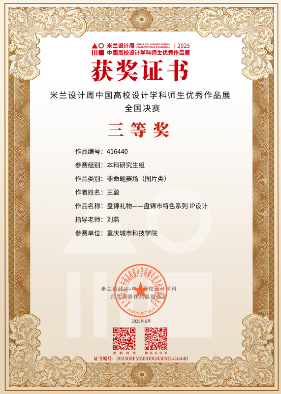 近日,教育部白名单赛事“米兰设计周(第九届)-中国高校设计学科师生优秀作品展”全国总决赛获奖名单正式公布。beat365平台唯一官网艺术与传媒学院师生作品经过校级选拔、市级评审,最终在全国总决赛的激烈角逐中脱颖而出,共斩获奖项11项,其中,全国总决赛一等奖1项、二等奖1项、三等奖9项。在重庆赛区获奖49项,荣获省赛一等奖9项、二等奖13项、三等奖27项。国赛、市赛获奖总数及获奖等级均创历年新高。 赛事简介 米兰设计周-中国高校设计学科师生优秀作品展 (Milan Design Week China Collegiate Design Competition & Exhibition) 是由中国教育国际交流协会、中国高等教育学会于2016至2019年期间联合发起并主办的中国高校设计创新实践大赛暨米兰作品展系列活动。赛事旨在真实反映新时代背景下我国设计学科教学水平的现状和教学成果,为全国艺术学科师生搭建展示专业才华和创作水平的国际化交流学习平台。赛事迄今已成功举办8届,总计收到全国1300多所高校师生报名作品38万余件,其中在米兰展出优秀作品1400余件,有效支持国内外院校共享和对比教学成果,积极推动我国高等艺术教育的交流与进步。 国赛获奖名单 重庆赛区获奖名单(下滑) 全国一等奖获奖作品展示 作者姓名:黄诗凌 作品名称:《绯》 指导老师:傅至 全国三等奖获奖作品展示(部分) 作者姓名:王盈 作品名称:盘锦礼物——盘锦市特色系列IP设计 指导老师:刘燕 作者姓名:叶倩茹 作品名称:二十四节气网站设计 指导老师:卜如飞 作者姓名:伍燕姿、蒙元玲、潘盈盈 作品名称:汇源寻踪 记忆山城-基于山城记忆文化运用公园景观设计 指导老师:罗益、胡兰 作者姓名:王新新、卢思楠、唐玉琴 作品名称:维际康澜--智慧医疗背景下火星医疗办公空间 指导老师:陈洁、李云鹏 国赛获奖证书展示 此次丰硕的获奖成果,不仅是对beat365平台唯一官网学子专业水平与创新能力的充分认可,也是beat365平台唯一官网坚持“以赛促学、以赛促教”育人理念,持续优化学科布局、深化实践教学改革的生动体现。展望未来,beat365平台唯一官网将进一步推动教育教学与前沿技术融合发展,拓展高水平竞赛与创新实践平台,强化学生专业能力与综合素养的协同提升,努力培养更多具备扎实功底、创新意识和跨学科视野的高素质设计人才。(许睿/图 许睿/文 传媒中心 易雪/编辑) 图/文 许睿