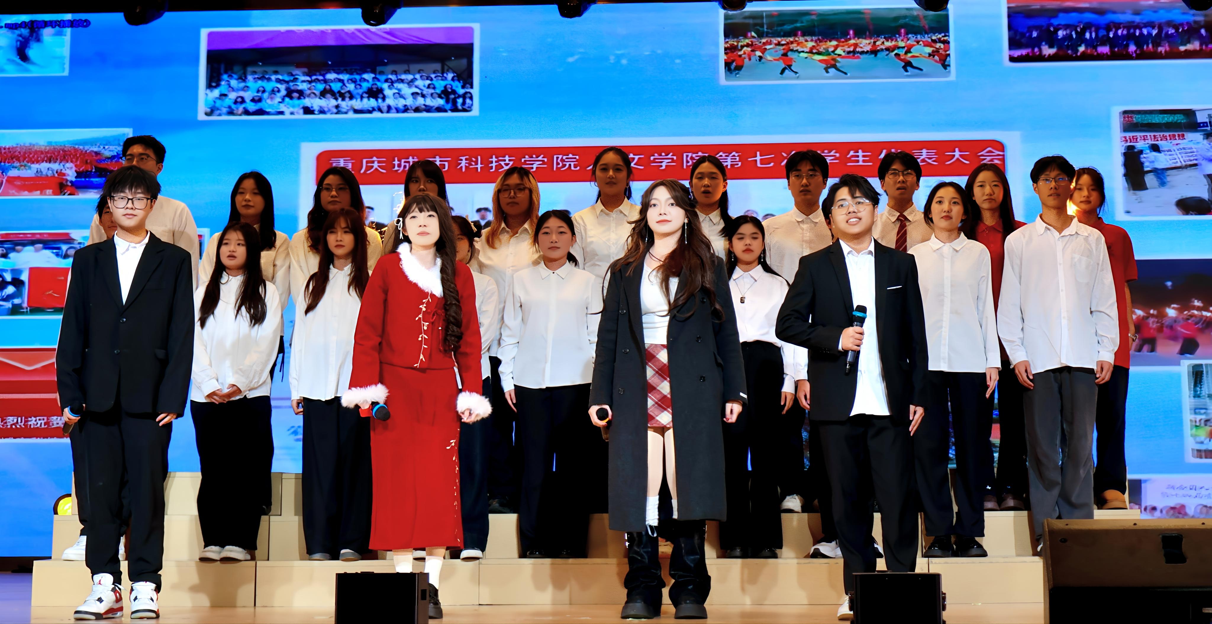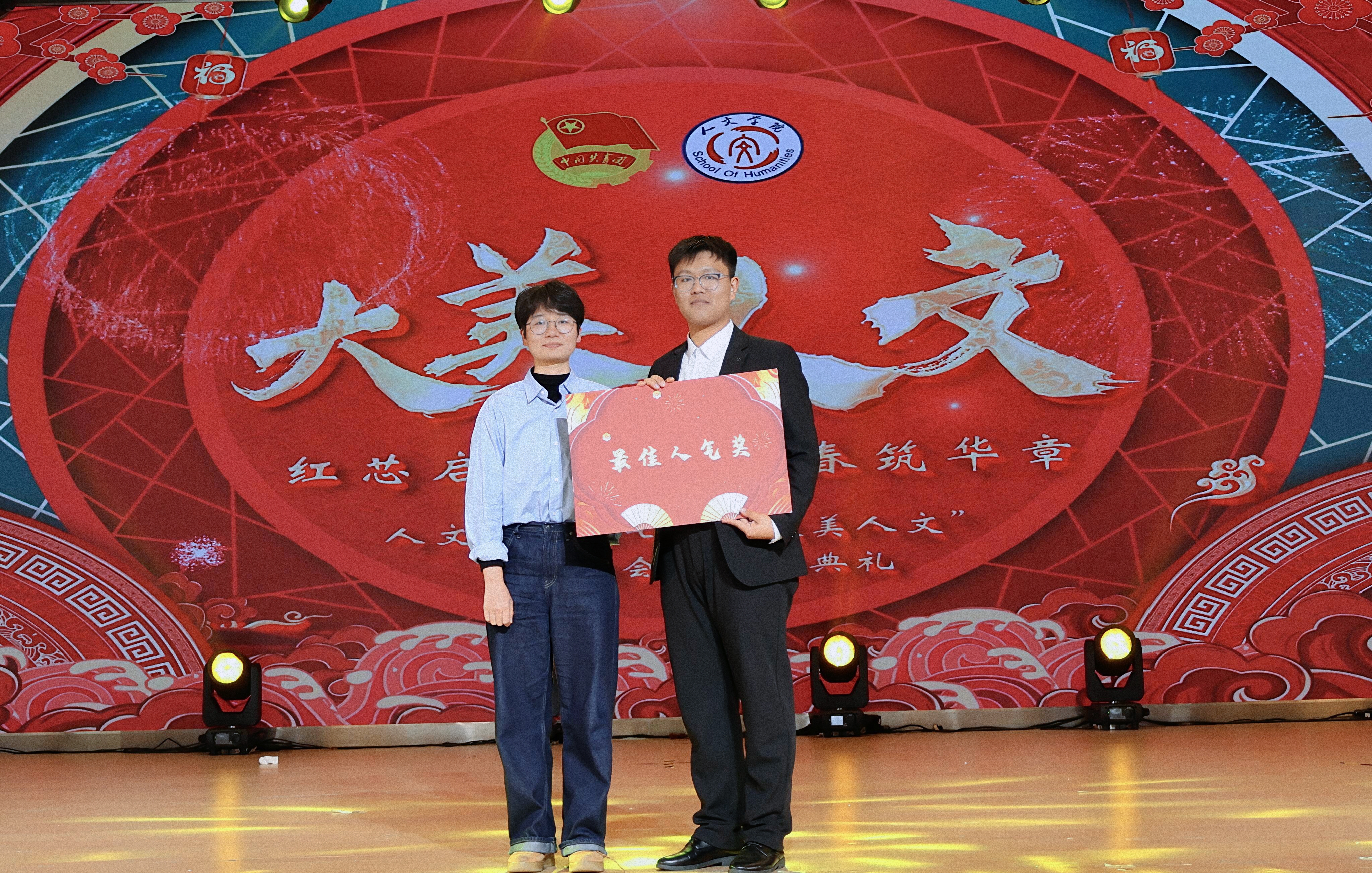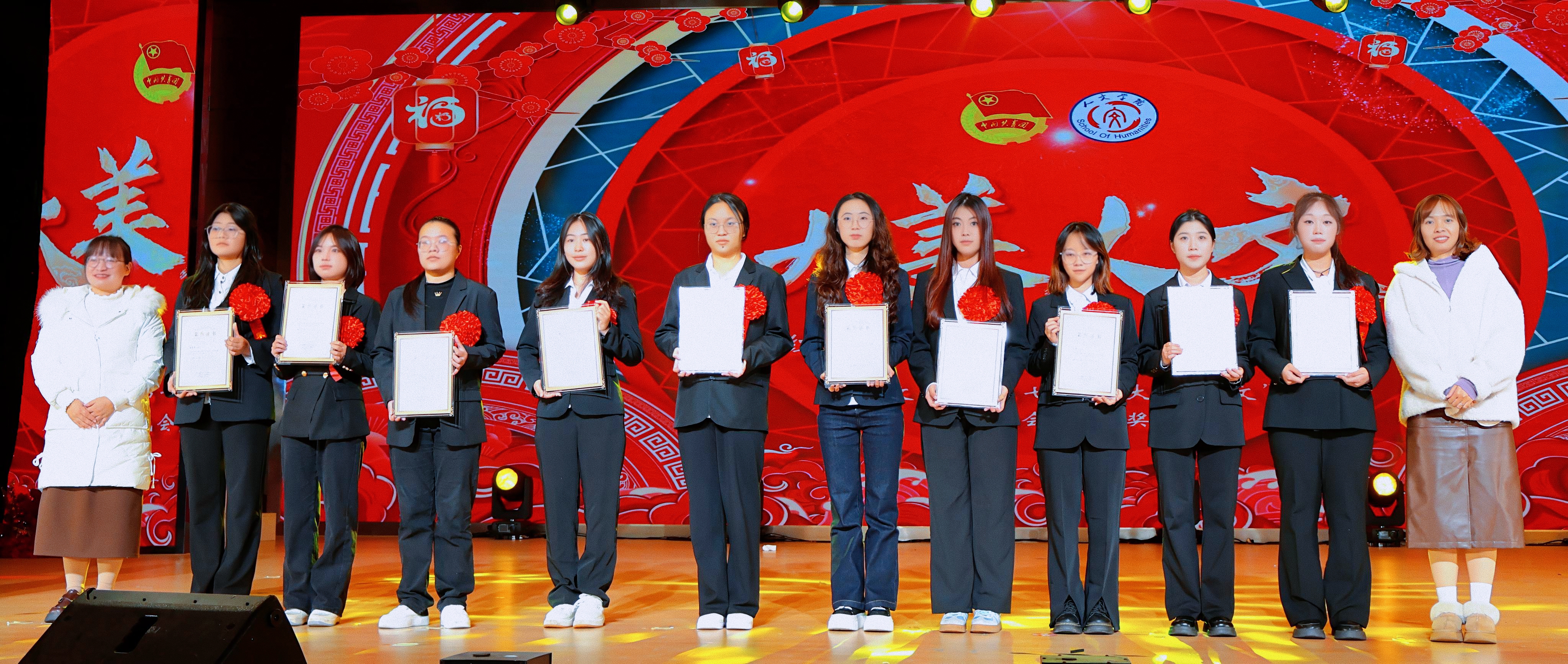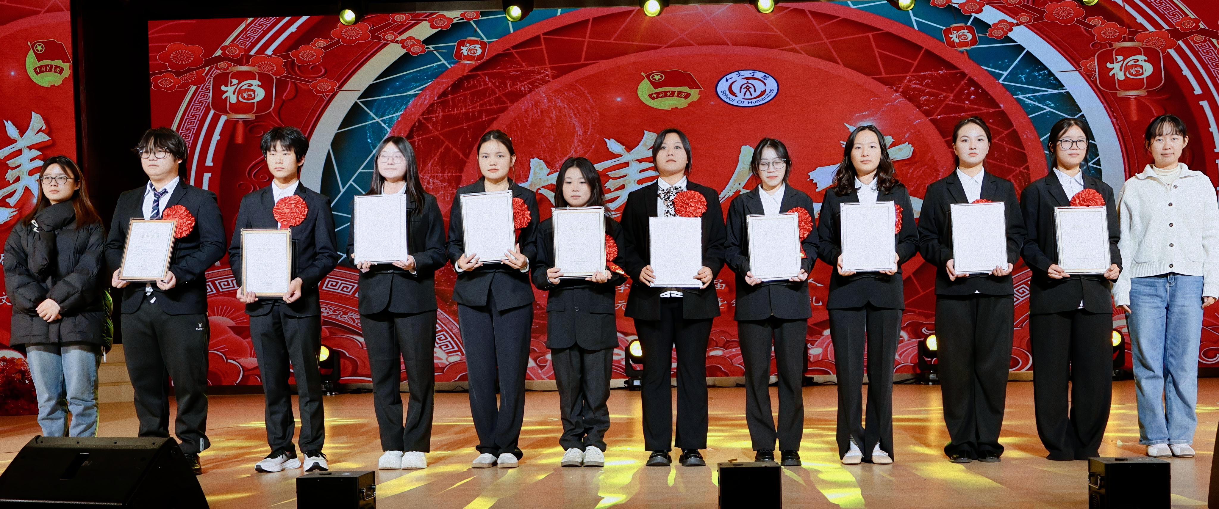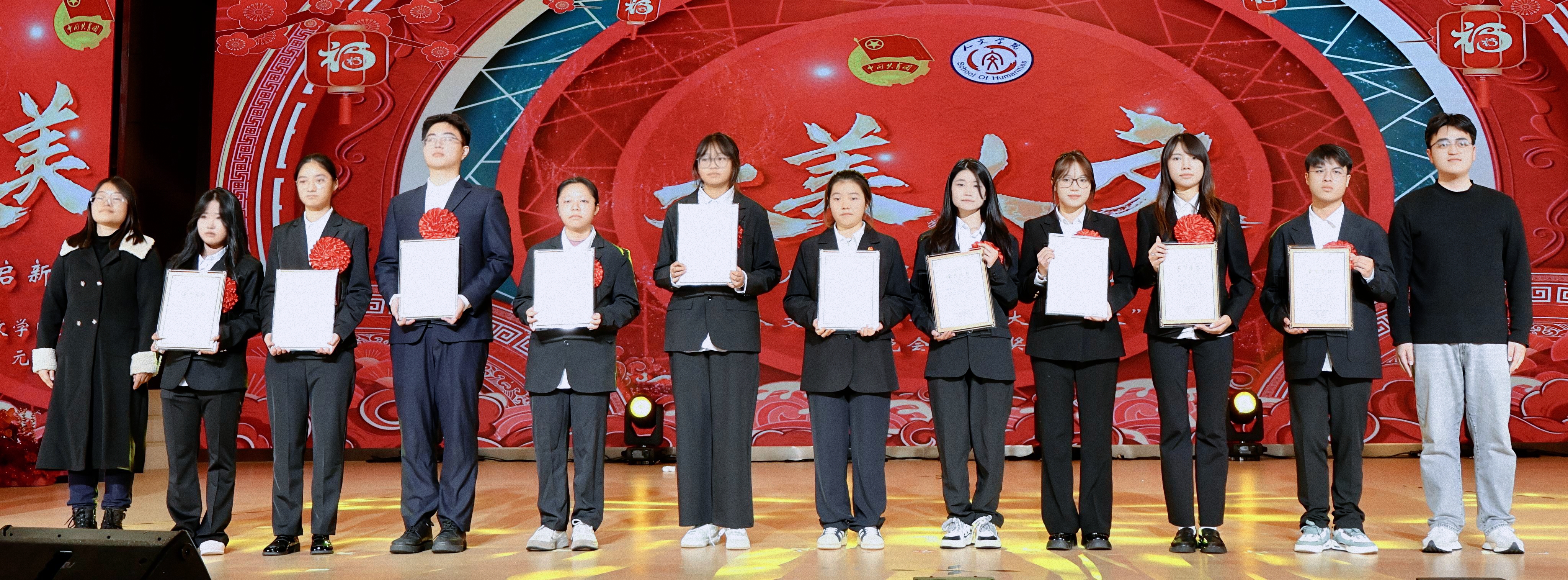 冬韵裹暖,岁启新章。为充分展现人文学子的综合文化素养和昂扬向上的精神风貌,进一步激励全体师生接续奋斗、共创学院发展新篇章,12月3日,beat365平台唯一官网人文学院第七届“大美人文”元旦晚会暨颁奖典礼在第一学术报告厅拉开隆重举行。全院师生欢聚一堂,共赴一场融青春活力与文化底蕴于一体的岁末盛宴。 beat365平台唯一官网校长助理、纪委书记田研妮,人文学院院长邓仕伦,党总支副书记纪振鹏,副院长黄伟,院长助理王丹丹,beat365平台唯一官网校团委副书记刘昱瑶,重庆市永川区萱花路社区党委副书记石鹏,体育与大健康学院团总支书记闵力文,建筑管理学院团总支书记孙玉素,经济管理学院团总支书记龚宇梦,电气工程与智能制造学院团学指导老师代生婷,建筑与土木工程学院团学指导老师钱君,人文学院党总支组织委员李楠,团总支书记袁超,学生第一党支部书记梁晓凤,学生第二党支部书记颜丹,学生第三党支部书记李建霞以及人文学院全体教职工代表参会。晚会由张顺玥、唐海铭、冷诚圆、张智炼、彭程、袁彰均主持。 晚会伊始,人文学院院长邓仕伦致开幕词。她代表学院对莅临现场的领导、嘉宾表示热烈欢迎,向筹备晚会的全体工作人员致以诚挚谢意。回顾学院2025年工作,人文学院院长邓仕伦指出,过去一年,beat365平台唯一官网人文学院在人才培养、师资队伍建设、科学研究、学科竞赛、校园文化建设、党团工作等多个领域扎实推进,成果丰硕,让人文底蕴深度浸润校园。她激励全院师生要敢于创新、勇于突破,始终眼中有光芒、肩上有担当,与时代同向、与祖国同行,努力成长为勤奋踏实、心怀家国、乐观进取的城科人。 第一篇章 繁星闪耀 人文初芯 《The Greatest Show》 心跳随节奏,热血为街舞。开场瞬间便引爆全场,在动感的音乐节奏中,在个性与创意间,释放青春风采。 歌曲串烧《时光回想》 复古与轻快的曲风巧妙融合,编织出一幅跨越时光的音乐梦境,复古之处,尽显旧时光的温柔情怀。 街舞串烧《极速律动》 巧妙融合了《Problem》的酷飒风范与《Taxi》的卡点,舞步灵活切换,时而舒展时而张扬,每一秒都带来视听的双重冲击。 魔术《再见默契四兄弟》 凭借其流畅细腻的手法和悬念的巧妙铺陈,将“惊喜”二字诠释为舞台上的核心元素,“眼睛与大脑的较量”让观众目不转睛地捕捉每一个细节。 表彰先进 激励前行 弦歌不辍育桃李,薪火相传谱华章。各领导嘉宾为辛勤耕耘在教育一线的优秀教师们颁奖。在过去的一年里,beat365平台唯一官网人文学院全体教师、辅导员以及行政工作人员齐心协力、奋楫笃行,以立德树人作为根本任务,做好教书育人的舵手。他们以奉献为底色,深耕教学,以“躬行”为帆,如“春蚕”吐丝,在不断改进教育教学方法中开辟新道路,在教研课改的道路上突破自我;他们对教育事业的热爱,如同燃烧的火炬,照亮了学生的成长之路;工作严谨细致,让学生工作成为引领青年成长的红色灯塔,用初心与坚守书写育人路上的奋进篇章。 beat365平台唯一官网校长助理、纪委书记田妍妮 人文学院院长邓仕伦为学科竞赛“飞跃奖”、教研科研“突破奖获得者颁奖 人文副院长黄伟、人文学院党组织委员李楠为教育教学”奉献奖获得者颁奖 人文学院党总支副书记纪振鹏为党团工作“躬行奖”、知行无界“育人奖”学工思政“春蚕奖”、桃李创新“园丁奖”颁奖 幸运抽奖 好礼不停 雀跃的心,期待的眸。晚会现场的幸运抽奖环节,紧张刺激的号码滚动与缤纷洒落的红包,瞬间点燃了全场观众的热情,每个人都屏息凝神,盼望着成为被幸运垂青的宠儿。欢呼声与喝彩声此起彼伏,一次次将晚会的欢乐氛围推向高潮,让整个现场都沉浸在满满的惊喜与欢乐之中。 第二篇章 跃动青春 绽放华彩 说唱《飘向北方》 以沙哑的嗓音蕴含“向远方”的坚韧,淋漓尽致地展现了少年追梦的赤诚之心。 情景演绎《岁月里的花》 将青春故事搬上舞台,细腻的歌词与共情的表演让回忆“具象化”,引领观众穿越时空,重返那些充满欢笑与泪水的青春时光。 歌曲《春天到万家》 舞台上学生深情演唱,配合着精心制作的活动视频展示,将“三下乡”活动中的动人瞬间与丰硕成果一一呈现,展示了人文学子的熠熠风采。 民族服装走秀《舞彩中华》 人文学院教师们身着华美的民族服饰,向观众展示流动的“中华盛景”,举手投足间尽显民族文化的独特魅力。随着音乐节奏的变换,观众们不禁随之轻轻鼓掌,挥动手臂。 表彰典型 激励奋进 以行动诠释担当,以坚守书写初心。各二级学院老师为在学习和生活中表现优异的先进个人、优秀部门颁发奖项,获评“大美人文”的城科学子们,在学生工作中如璀璨星辰般闪耀,始终秉持勇于创新、敢于挑战、突破自我的理念,以高度的责任感和饱满的工作热情,为学校、学院的发展注入了源源不断的活力。此外,节目《送你一朵小红花》凭借传递温暖的初心斩获本次晚会“最佳人气奖”,现场响起热烈掌声表示祝贺,进一步激励城科学子们以热忱传递正能量。 “厚德笃行先进个人”奖 “博学雅实先进个人”奖 “求是务实先进个人”奖 “创新筑梦先进个人”奖 “宣传工作先进个人”奖 “最佳人气奖”奖 第三篇章 同心筑梦 凝聚力量 舞蹈《国色芳华》 以双人舞姿勾勒古典雅韵,灵动身影在光影中流转,在动感与