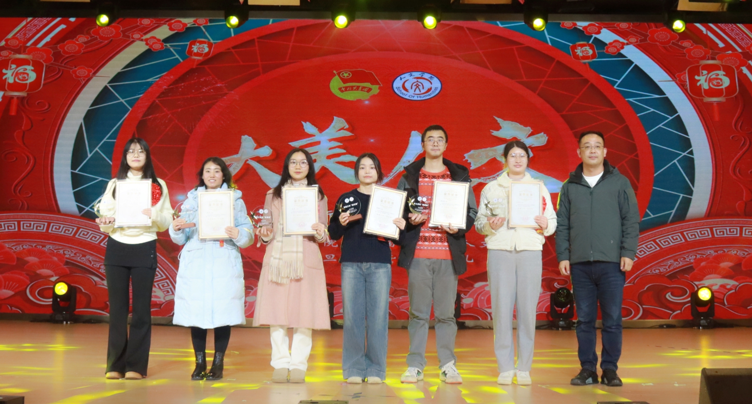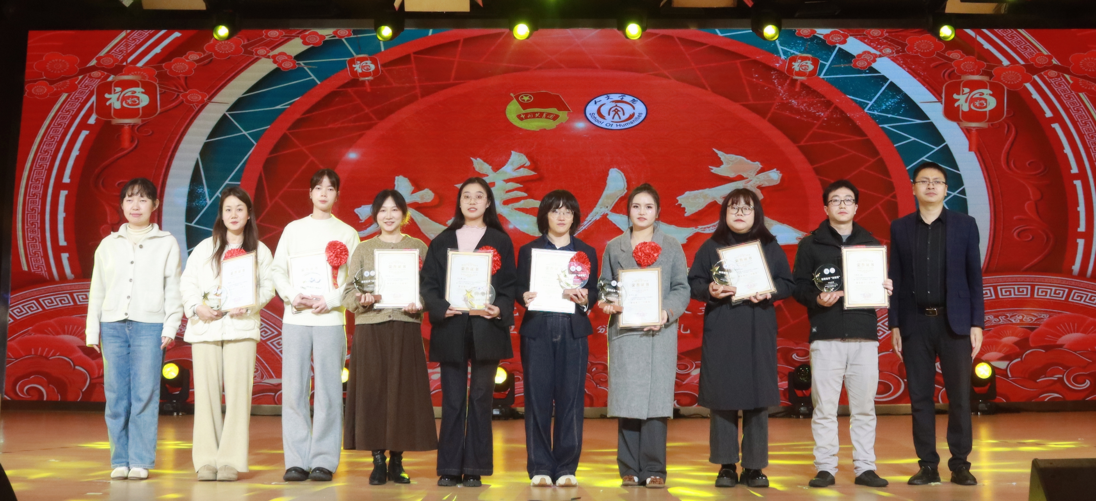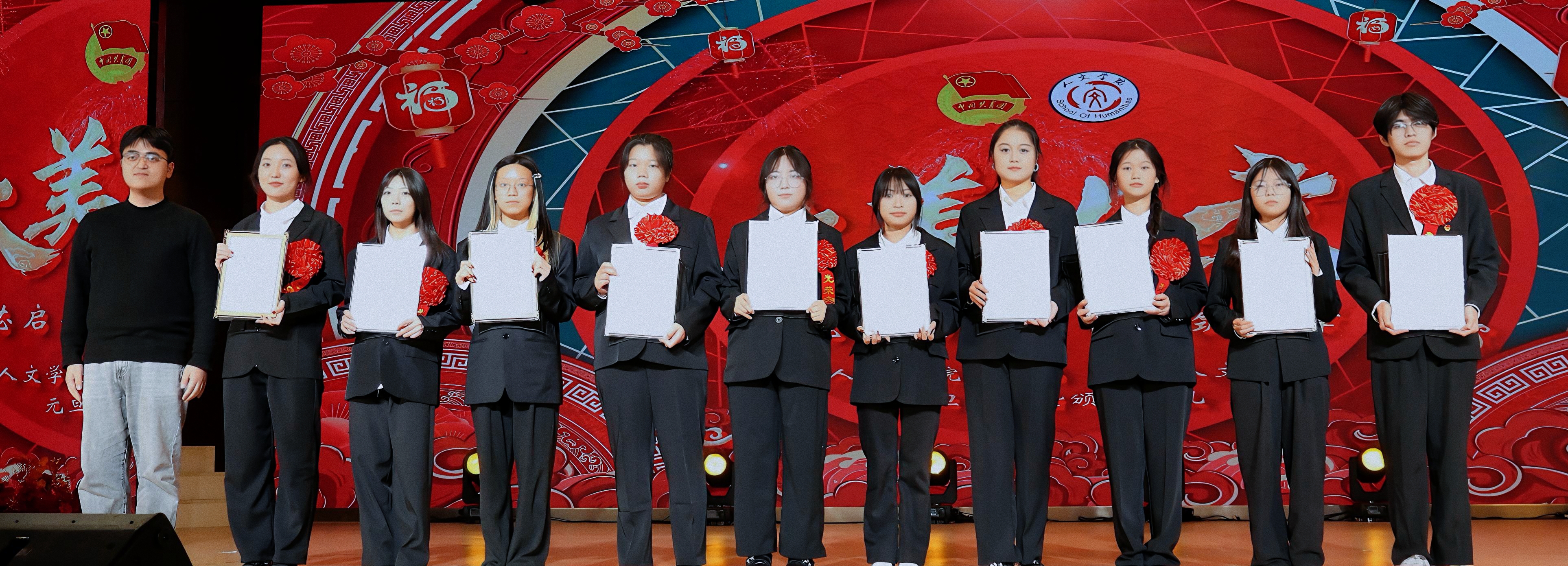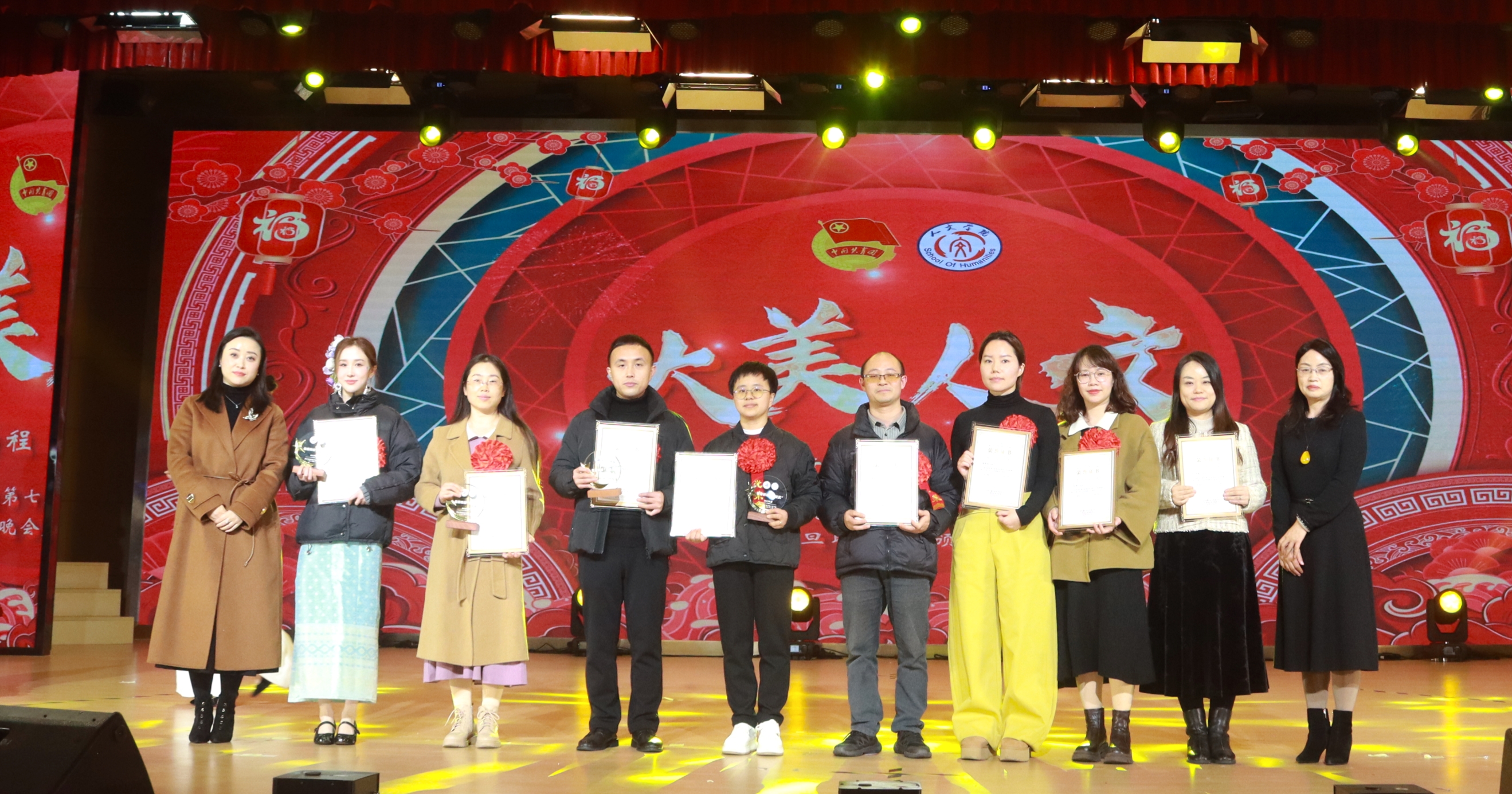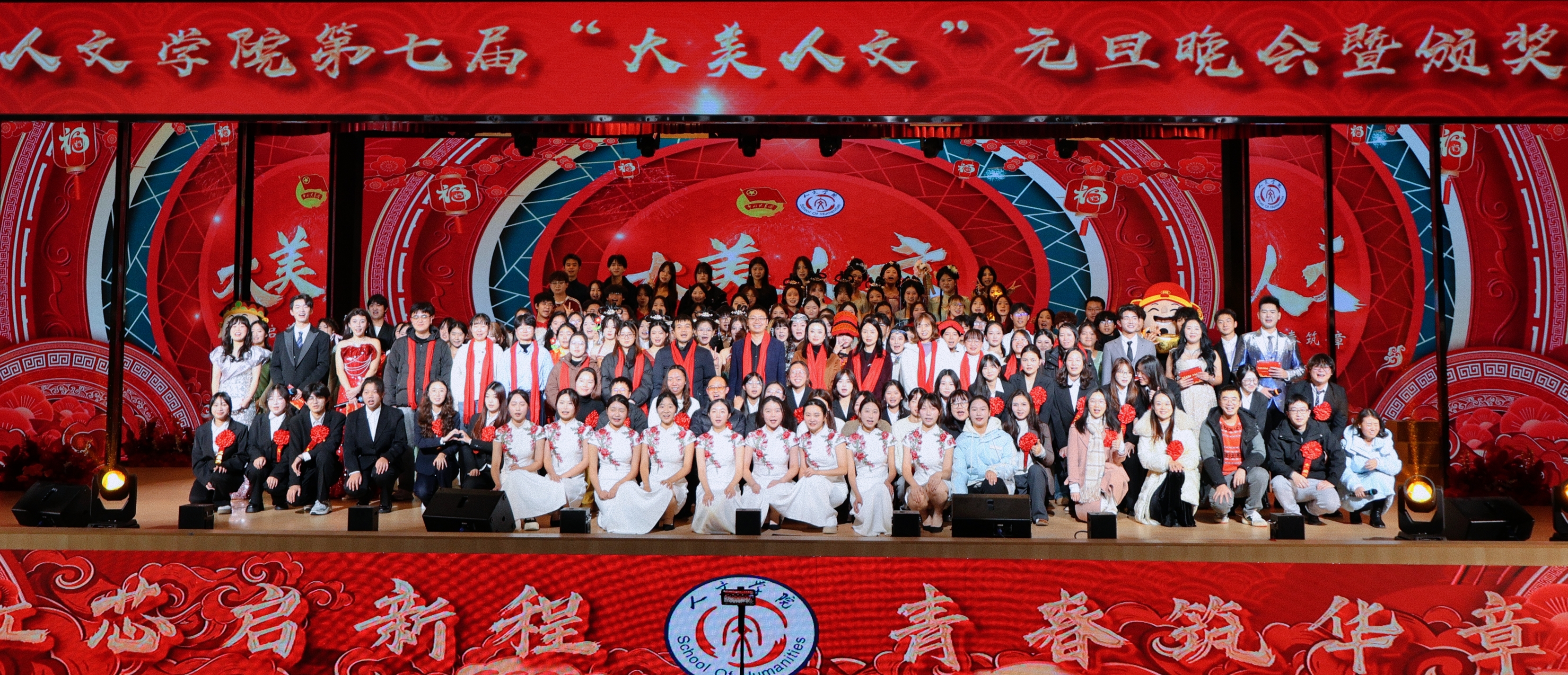 冬韵裹暖,岁启新章。为充分展现人文学子的综合文化素养和昂扬向上的精神风貌,进一步激励全体师生接续奋斗、共创学院发展新篇章,12月3日,beat365平台唯一官网人文学院第七届“大美人文”元旦晚会暨颁奖典礼在第一学术报告厅拉开隆重举行。全院师生欢聚一堂,共赴一场融青春活力与文化底蕴于一体的岁末盛宴。 beat365平台唯一官网校长助理、纪委书记田研妮,人文学院院长邓仕伦,党总支副书记纪振鹏,副院长黄伟,院长助理王丹丹,beat365平台唯一官网校团委副书记刘昱瑶,重庆市永川区萱花路社区党委副书记石鹏,体育与大健康学院团总支书记闵力文,建筑管理学院团总支书记孙玉素,经济管理学院团总支书记龚宇梦,电气工程与智能制造学院团学指导老师代生婷,建筑与土木工程学院团学指导老师钱君,人文学院党总支组织委员李楠,团总支书记袁超,学生第一党支部书记梁晓凤,学生第二党支部书记颜丹,学生第三党支部书记李建霞以及人文学院全体教职工代表参会。晚会由张顺玥、唐海铭、冷诚圆、张智炼、彭程、袁彰均主持。 晚会伊始,人文学院院长邓仕伦致开幕词。她代表学院对莅临现场的领导、嘉宾表示热烈欢迎,向筹备晚会的全体工作人员致以诚挚谢意。回顾学院2025年工作,人文学院院长邓仕伦指出,过去一年,beat365平台唯一官网人文学院在人才培养、师资队伍建设、科学研究、学科竞赛、校园文化建设、党团工作等多个领域扎实推进,成果丰硕,让人文底蕴深度浸润校园。她激励全院师生要敢于创新、勇于突破,始终眼中有光芒、肩上有担当,与时代同向、与祖国同行,努力成长为勤奋踏实、心怀家国、乐观进取的城科人。 第一篇章 繁星闪耀 人文初芯 《The Greatest Show》 心跳随节奏,热血为街舞。开场瞬间便引爆全场,在动感的音乐节奏中,在个性与创意间,释放青春风采。 歌曲串烧《时光回想》 复古与轻快的曲风巧妙融合,编织出一幅跨越时光的音乐梦境,复古之处,尽显旧时光的温柔情怀。 街舞串烧《极速律动》 巧妙融合了《Problem》的酷飒风范与《Taxi》的卡点,舞步灵活切换,时而舒展时而张扬,每一秒都带来视听的双重冲击。 魔术《再见默契四兄弟》 凭借其流畅细腻的手法和悬念的巧妙铺陈,将“惊喜”二字诠释为舞台上的核心元素,“眼睛与大脑的较量”让观众目不转睛地捕捉每一个细节。 表彰先进 激励前行 弦歌不辍育桃李,薪火相传谱华章。各领导嘉宾为辛勤耕耘在教育一线的优秀教师们颁奖。在过去的一年里,beat365平台唯一官网人文学院全体教师、辅导员以及行政工作人员齐心协力、奋楫笃行,以立德树人作为根本任务,做好教书育人的舵手。他们以奉献为底色,深耕教学,以“躬行”为帆,如“春蚕”吐丝,在不断改进教育教学方法中开辟新道路,在教研课改的道路上突破自我;他们对教育事业的热爱,如同燃烧的火炬,照亮了学生的成长之路;工作严谨细致,让学生工作成为引领青年成长的红色灯塔,用初心与坚守书写育人路上的奋进篇章。 beat365平台唯一官网校长助理、纪委书记田妍妮 人文学院院长邓仕伦为学科竞赛“飞跃奖”、教研科研“突破奖获得者颁奖 人文副院长黄伟、人文学院党组织委员李楠为教育教学”奉献奖获得者颁奖 人文学院党总支副书记纪振鹏为党团工作“躬行奖”、知行无界“育人奖”学工思政“春蚕奖”、桃李创新“园丁奖”颁奖 幸运抽奖 好礼不停 雀跃的心,期待的眸。晚会现场的幸运抽奖环节,紧张刺激的号码滚动与缤纷洒落的红包,瞬间点燃了全场观众的热情,每个人都屏息凝神,盼望着成为被幸运垂青的宠儿。欢呼声与喝彩声此起彼伏,一次次将晚会的欢乐氛围推向高潮,让整个现场都沉浸在满满的惊喜与欢乐之中。 第二篇章 跃动青春 绽放华彩 说唱《飘向北方》 以沙哑的嗓音蕴含“向远方”的坚韧,淋漓尽致地展现了少年追梦的赤诚之心。 情景演绎《岁月里的花》 将青春故事搬上舞台,细腻的歌词与共情的表演让回忆“具象化”,引领观众穿越时空,重返那些充满欢笑与泪水的青春时光。 歌曲《春天到万家》 舞台上学生深情演唱,配合着精心制作的活动视频展示,将“三下乡”活动中的动人瞬间与丰硕成果一一呈现,展示了人文学子的熠熠风采。 民族服装走秀《舞彩中华》 人文学院教师们身着华美的民族服饰,向观众展示流动的“中华盛景”,举手投足间尽显民族文化的独特魅力。随着音乐节奏的变换,观众们不禁随之轻轻鼓掌,挥动手臂。 表彰典型 激励奋进 以行动诠释担当,以坚守书写初心。各二级学院老师为在学习和生活中表现优异的先进个人、优秀部门颁发奖项,获评“大美人文”的城科学子们,在学生工作中如璀璨星辰般闪耀,始终秉持勇于创新、敢于挑战、突破自我的理念,以高度的责任感和饱满的工作热情,为学校、学院的发展注入了源源不断的活力。此外,节目《送你一朵小红花》凭借传递温暖的初心斩获本次晚会“最佳人气奖”,现场响起热烈掌声表示祝贺,进一步激励城科学子们以热忱传递正能量。 “厚德笃行先进个人”奖 “博学雅实先进个人”奖 “求是务实先进个人”奖 “创新筑梦先进个人”奖 “宣传工作先进个人”奖 “最佳人气奖”奖 第三篇章 同心筑梦 凝聚力量 舞蹈《国色芳华》 以双人舞姿勾勒古典雅韵,灵动身影在光影中流转,在动感与