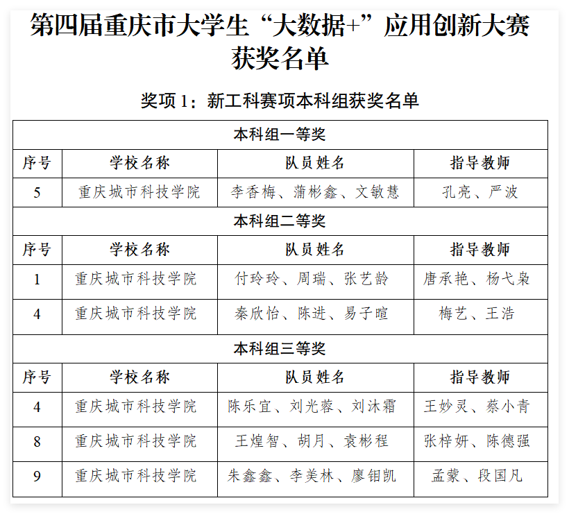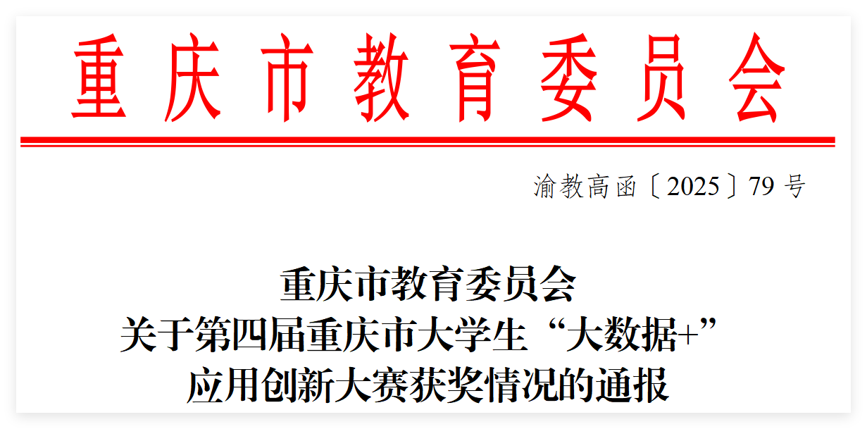 近日,重庆市教育委员会主办的第四届重庆市大学生“大数据+”应用创新大赛圆满收官。大赛以“大数据+”融合应用为牵引,面向新工科、新文科领域搭建创新实践平台有效提升大学生创新精神与实践能力,带动高校课外科技活动的常态化、体系化发展。