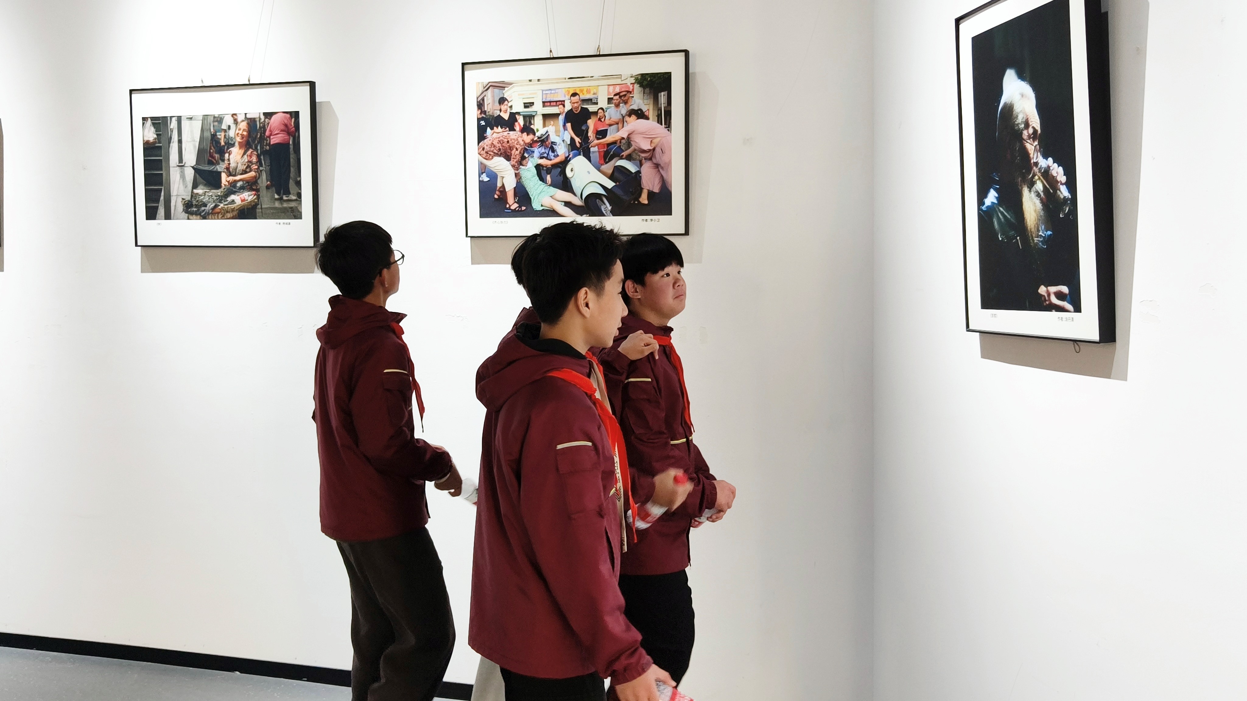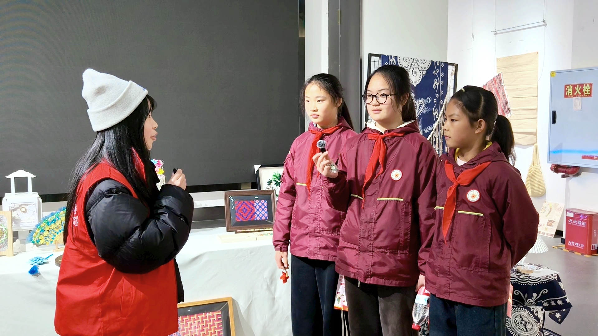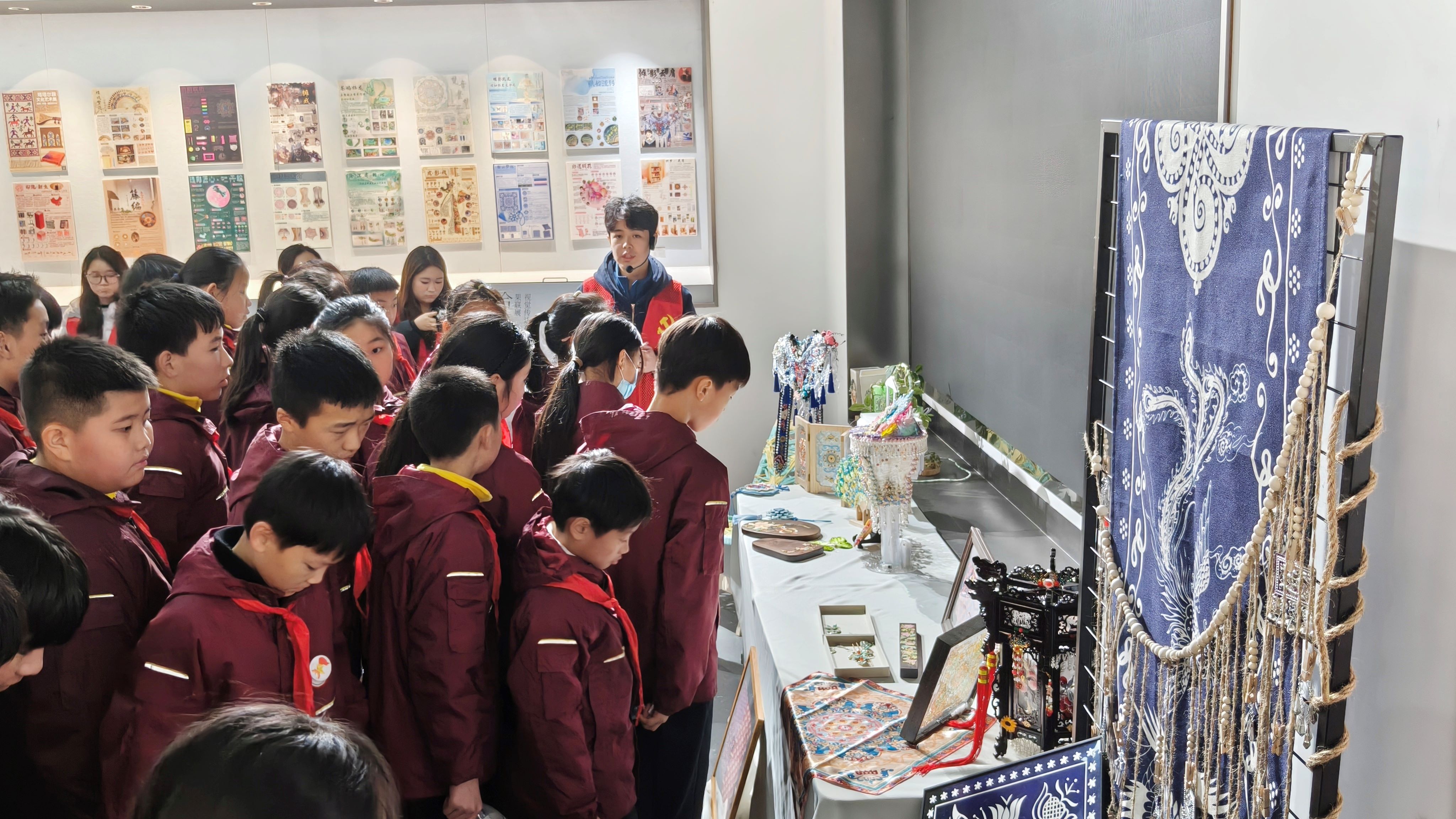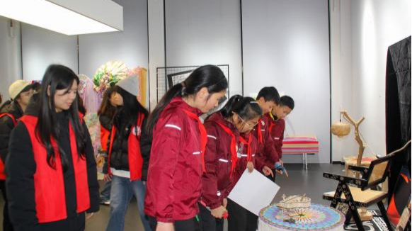 步入求是楼艺术展厅,同学们沉醉于画作与装置艺术构成的视觉盛宴。志愿者以童趣化语言解析创作逻辑与技法,引导他们观察色彩形态、解读符号情感。这场欣赏既以美育浸润心灵,更通过观察分析训练思维,拓宽智识边界。