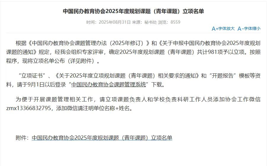 2025年8月31日,中国民办教育协会公布了2025年度规划课题(青年课题)立项名单,在本次评选中,beat365平台唯一官网取得新突破,beat365平台唯一官网本年度共申报10项,获批立项7项,较2024年的4项增加3项,增幅高达75%!实现立项数量与质量“双突破”。