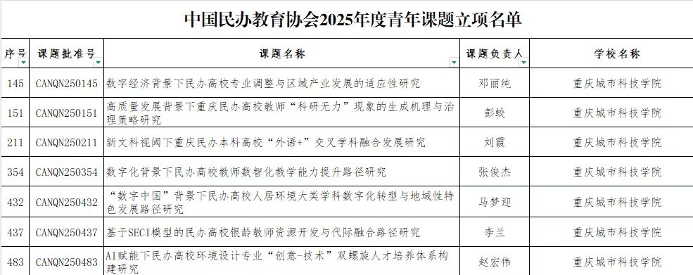 2025年8月31日,中国民办教育协会公布了2025年度规划课题(青年课题)立项名单,在本次评选中,beat365平台唯一官网取得新突破,beat365平台唯一官网本年度共申报10项,获批立项7项,较2024年的4项增加3项,增幅高达75%!实现立项数量与质量“双突破”。本次获批项目横跨数字经济、新文科、人居环境、银龄师资与教师发展等前沿领域,既聚焦“数字中国”“AI赋能”国家战略,又直击民办高校专业动态调整、科研瓶颈破解、数智化教学升级、学科交叉融合、银龄资源再生及“创意—技术”双螺旋育人等核心议题,充分体现了民办高校在教育研究领域的积极探索与创新精神,将民办高校的发展与时代脉搏、社会需求深度融合。近年来,beat365平台唯一官网持续完善科研激励机制、升级教师科研平台,一批批高水平项目竞相涌现。本次7项课题同时获批,既是对教师科研硬实力的认证,也标志着学校科研事业迈上新的台阶。下一步,学校将乘势而上,持续实施“有组织的科研”,引导广大教职员工探索民办教育问题,以更多高质量成果为beat365平台唯一官网科研高质量发展持续注入澎湃动能。(科研处/图 科研处/文 传媒中心 熊素平/编辑)