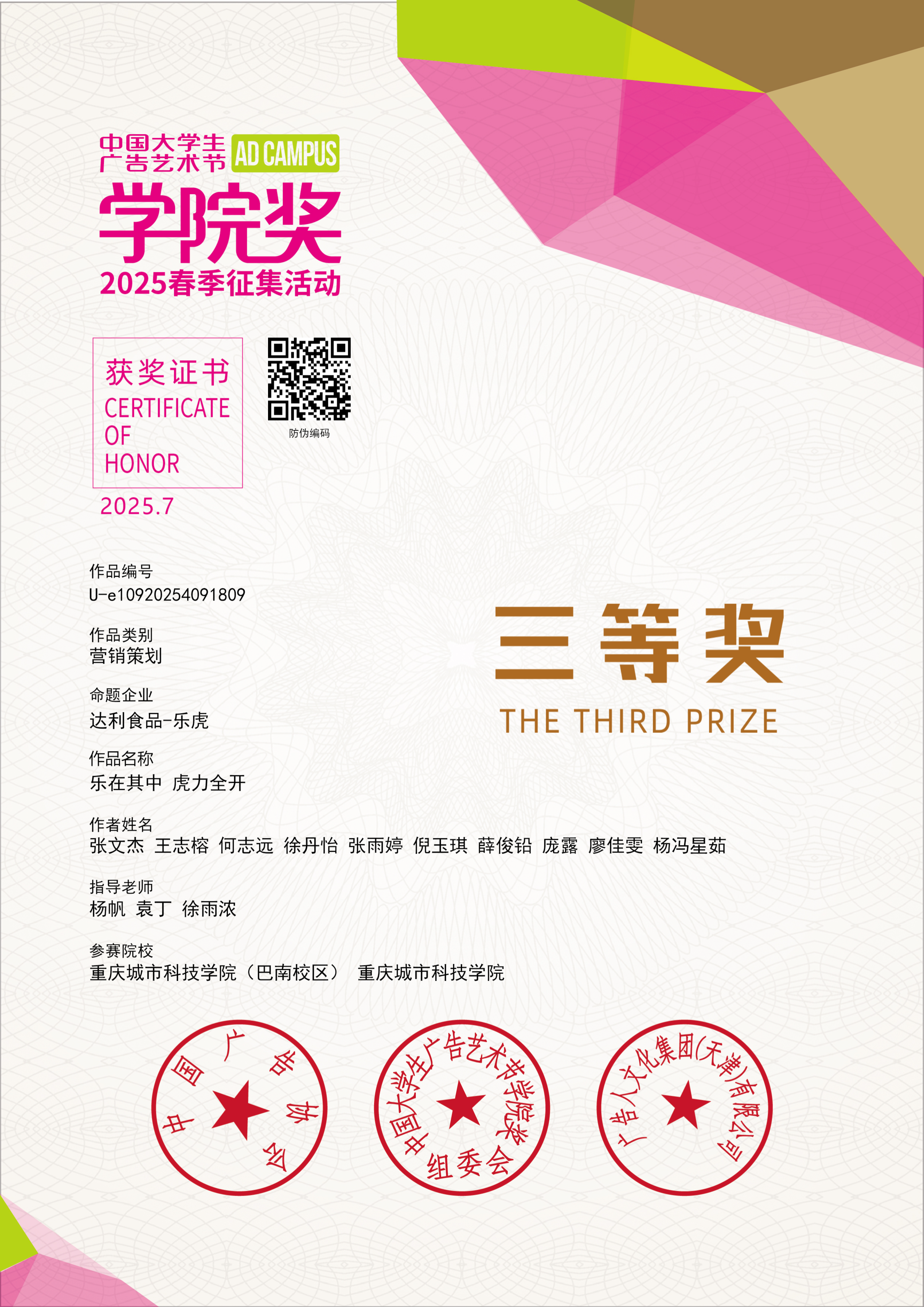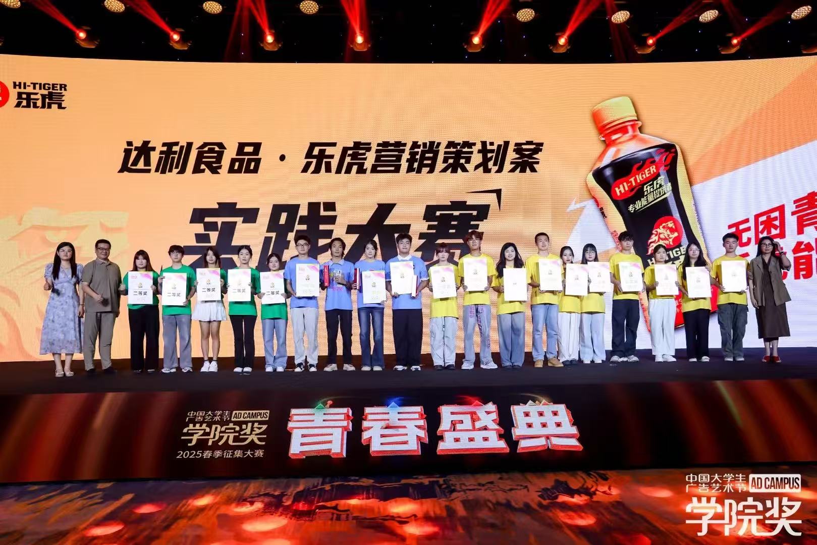 近日,全国高校关注的学院奖2025大赛(春季赛)圆满落幕。由beat365平台唯一官网艺术与传媒学院学子组建的“川渝猛虎队”,凭借创意方案与扎实的实践落地能力,从全国123个大学生项目组368场活动中脱颖而出,在2025达利食品乐虎营销策划案实践大赛中成功斩获铜奖,奖金1000元。杨帆、袁丁、徐雨浓三位老师获得2025学院奖春季征集活动乐虎杰出指导教师荣誉。 艺术与传媒学院奖作为中国广告教育领域极具影响力的专业赛事,始终以“创意赋能实践”为核心,吸引了众多高校广告、设计、传媒等专业学子参与。beat365平台唯一官网川渝猛虎队参加了由达利食品集团与国家级赛事学院奖联合发起的“2025达利食品乐虎营销策划实践大赛”,该大赛旨在通过自己策划、自己落地的方式,提升大学生市场营销、品牌策划、资源整合及团队协作等能力,让策划不再纸上谈兵。beat365平台唯一官网学生团队在大赛过程中,积极参与项目策划与执行,展现了良好的专业知识应用能力、创新思维以及出色的沟通协调能力,达利食品集团对beat365平台唯一官网川渝猛虎队在大赛中的优异表现给予认可,并为学生团队开具了实习证明。beat365平台唯一官网艺术与传媒学院获中国大学生广告艺术节学院奖、创意星球网与达利食品集团联合颁发的“2025年度产教融合实践基地”奖项。 “川渝猛虎队”师生团队受邀前往北京广播大厦参加中国大学生广告艺术节学院奖2025春季征集大赛成果发布会·青春盛典。颁奖典礼现场汇聚了来自全国各高校的优秀参赛团队、广告行业资深专家及品牌代表,是一场兼具创意交流与行业视野的盛会。活动中,“川渝猛虎队”成员不仅获得荣誉证书,还受邀接受采访与其他高校学子分享了作品创作思路,充分展现了beat365平台唯一官网学子积极向上、勇于创新的精神风貌。 此次获奖不仅是对beat365平台唯一官网学子专业能力的肯定,更是beat365平台唯一官网“以赛促学、以赛促教”人才培养模式的又一成果体现。近年来,艺术与传媒学院始终注重将课堂教学与行业实践相结合,鼓励学生参与各类高水平专业赛事,通过实战锻炼提升专业技能与创新思维,为广告、传媒行业培养了一批高素质应用型人才。未来,艺术与传媒学院将继续深化产教融合,为学生搭建更多优质的实践与展示平台,助力更多学子在专业领域持续成长、绽放光彩。(杨帆/图 文 传媒中心 谢秋雨/编辑)