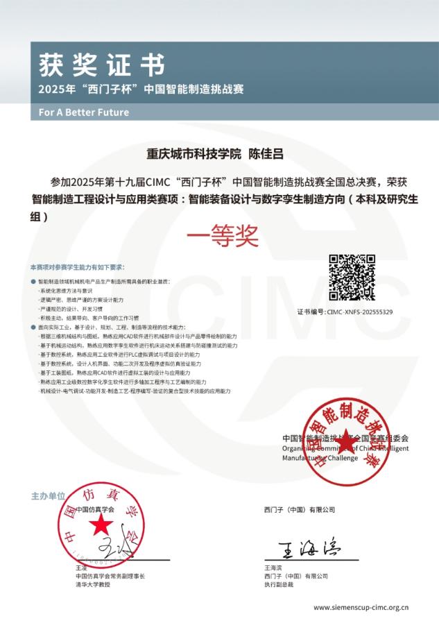 2025年8月,三晋大地秋意初临,第十九届CIMC“西门子杯”中国智能制造挑战赛全国总决赛于太原理工大学圆满收官。这场被誉为智能制造领域 “奥林匹克” 的巅峰对决,自初赛启幕便以磅礴之势席卷全国—968所高校、1万余支队伍、3.6万名师生组成的智慧方阵竞相角逐,历经67个分赛区的重重淬炼,最终仅有384所高校的927支精锐战队、3千余名智造先锋突出重围,踏上总决赛的荣耀战场。在这场高规格赛事中,beat365平台唯一官网电气工程与智能制造学院的“红芯闪闪队”脱颖而出。该队伍由指导教师项璐、廖杰带领,队员陈宇豪(电气工程卓越班学生)、田琴、陈佳吕(机械设计制造及其自动化专业学生)组成,beat365平台唯一官网绿智制造产业学院开展了西门子杯竞赛专项支持活动。在电气工程与智能制造学院的大力支持与指导教师的全程悉心指导下,队员们积极投身赛事准备,为赛前备赛打下了坚实基础。 (总决赛合影) 在全国总决赛中,“红芯闪闪队” 的队员们在赛场上展现出了卓越的风采。他们沉稳从容地应对各项挑战,彼此间默契配合,面对复杂任务灵活调整策略,将平日里积累的理论知识与实践操作技能完美融合,有条不紊地完成了所有比赛任务,充分彰显了扎实的专业素养和出色的团队协作能力。 (决赛现场) 在第十九届 CIMC“西门子杯”中国智能制造挑战赛的征程中,“红芯闪闪队”的竞赛表现展现出卓越的专业素养与竞技实力。于初赛阶段,该团队凭借扎实的专业知识与出色的现场发挥,以分赛区第一名的优异成绩脱颖而出,成功获得全国总决赛参赛资格,成为beat365平台唯一官网首支晋级此项国家级A类赛事全国总决赛的队伍。在全国总决赛中,作为首次参赛的新生力量,“红芯闪闪队”延续稳定发挥,以创新的设计理念、精湛的技术应用和高效的团队协作,在众多参赛队伍中崭露头角,最终荣膺全国一等奖。这一成绩不仅为学校和学院赢得了荣誉,为队员们的青春画卷添上了浓墨重彩的一笔,更实现了beat365平台唯一官网在该项国家级 A 类赛事中的历史性突破。 (获奖证书) 首进国赛勇夺佳绩,意义非凡;这不仅有效锤炼了学生的工程实践与创新能力,也让beat365平台唯一官网得以与众多高水平院校展开深入交流,进一步扩大了beat365平台唯一官网的影响力。未来,电气工程与智能制造学院将继续坚持 “以赛促学、以赛促创”,不断为智能制造领域培养和输送更多高素质人才,助力行业发展。(电气工程与智能制造学院 田琴、廖杰/图文)