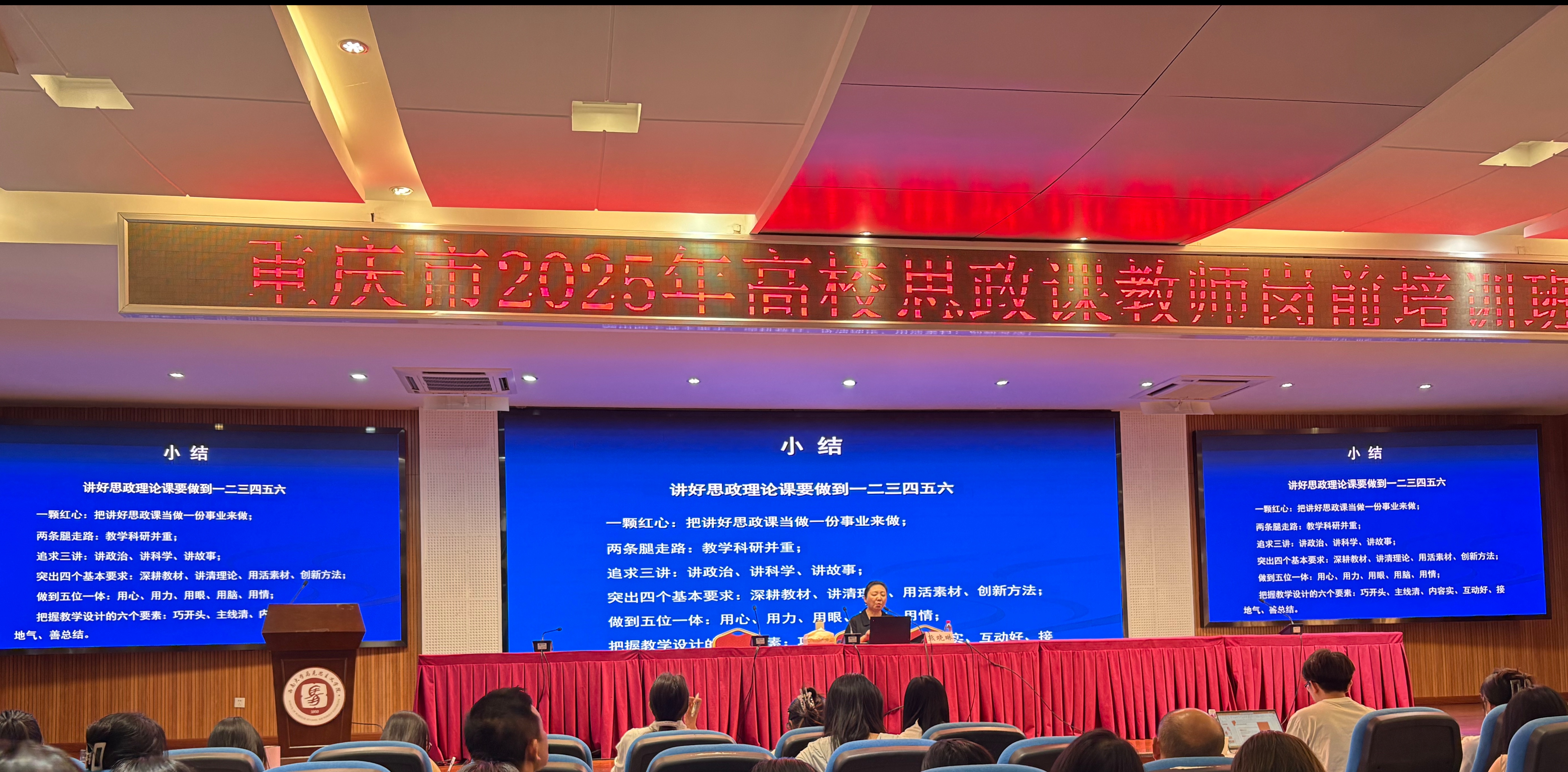 在教育改革与发展的关键时期,为深入学习贯彻习近平总书记关于学校思政课建设的重要讲话和指示精神,强化思政教育师资力量,提升高校思政课教学质量,推动新时代高校思政课高质量发展。2025年8月26日至8月30日,由中共重庆市委教育工委、重庆市教育委员会主办,教育部高校思想政治工作队伍培训研修中心承办的重庆市2025年高校思想政治理论课教师岗前培训在西南大学开班,马克思主义学院教师曾配源、杨庆参加学习。 本次培训采取专题报告和教学展示两种形式,数位专家学者开展授课,内容丰富多元,旨在帮助思政课教师深入理解党的创新理论,掌握前沿教学方法,更好地将思政教育与时代需求紧密结合。 在专题报告环节,中共重庆市委教育工委、市教委宣传处处长李林齐、西南大学原党委书记黄蓉生、四川大学马克思主义学院教授胡芳等专家,以《深入学习贯彻党的二十届三中全会精神 同步推进思政课建设与党的创新理论武装》《推动新时代高校思政课高质量发展的三大战略着力》《“习近平新时代中国特色社会主义思想”课程专题教学辅导》等为题,深入解读重要会议精神,指导教师将其融入教学,结合时代需求从教学内容、方法、师资等方面提出提升策略,助力提升新时代高校思政课质量。在教学展示环节,西南大学马克思主义学院副院长唐斌、重庆师范大学马克思主义学院教授兰桂萍等专家聚焦“习近平新时代中国特色社会主义思想概论”“毛泽东思想和中国特色社会主义理论体系概论”“马克思主义基本原理概论”“思想道德与法治”四门课程展开了内涵深刻、意蕴丰富的示范教学,凭借其深厚的专业素养和巧妙的教学设计,将抽象的理论生动化,展示了高质量的思政课堂范例。 培训期间,参训教师全身心投入专家学者高屋建瓴的专题报告和精彩纷呈的教学展示,认真学习,积极交流,收获颇丰。他们表示,此次培训所学,是责任亦是动力。未来,他们将以此次培训为契机,以深耕细作的态度,厚植思政教育根基,把党的创新理论融入课堂,用生动案例激活知识,以现代技术赋能教学,将所学所思转化为教学实践中的智慧与力量,用心用情用力培育时代新人,为铸就中华民族伟大复兴的中国梦源源不断输送有理想、敢担当、能吃苦、肯奋斗的栋梁之材。(马克思主义学院 图/文 传媒中心 谢秋雨/编辑)