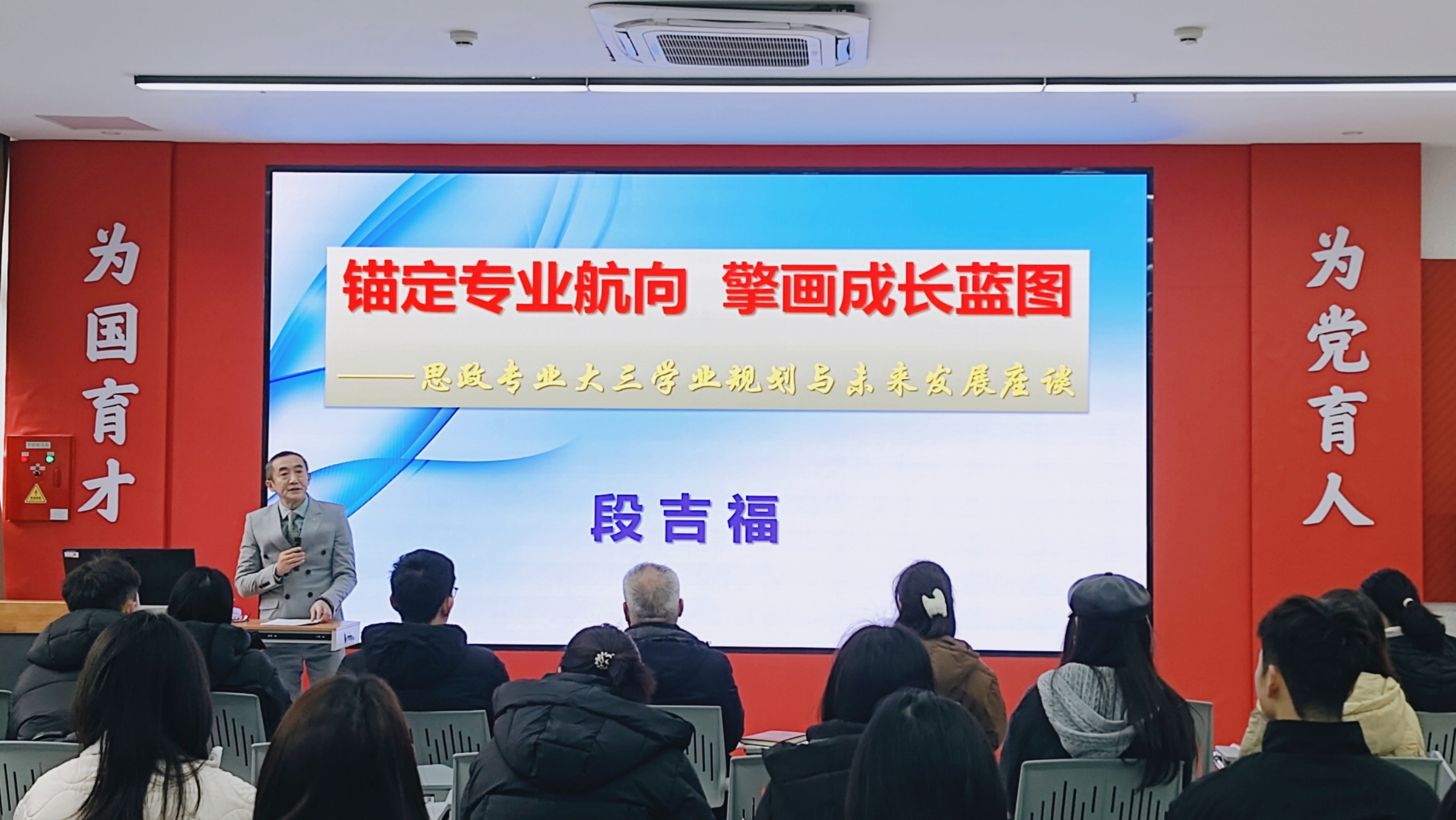 座谈会上,段吉福院长聚焦“大三学年的特殊定位”、“思政专业的时代使命”、“锚定航向”等话题,分享了他的观点。他指出,大三是大学四年的关键节点,站在人生的“黄金分割点”,同学应以高度的责任感和前瞻性思维,审视自身成长轨迹,精准定位发展方向,为步入社会或继续深造奠定坚实基础。