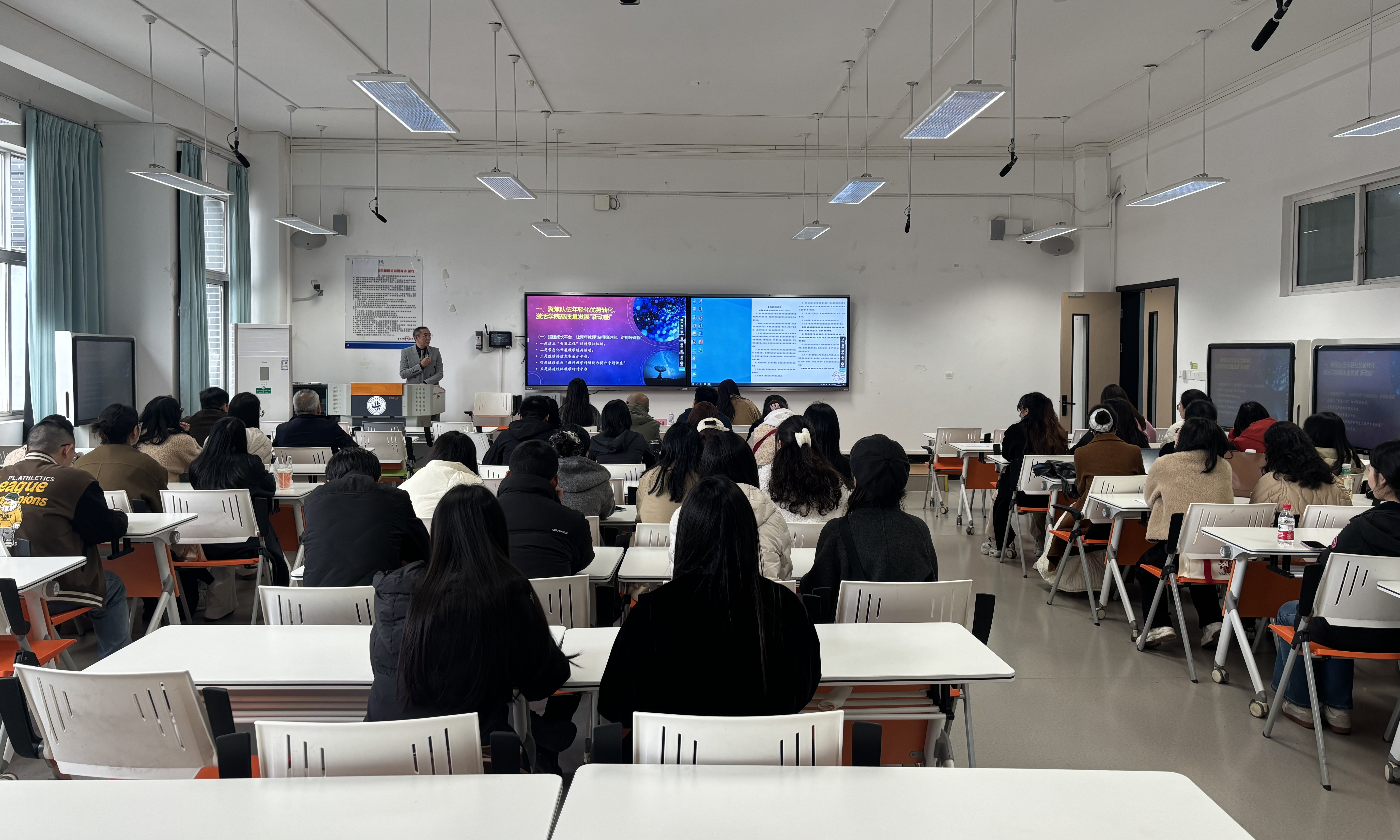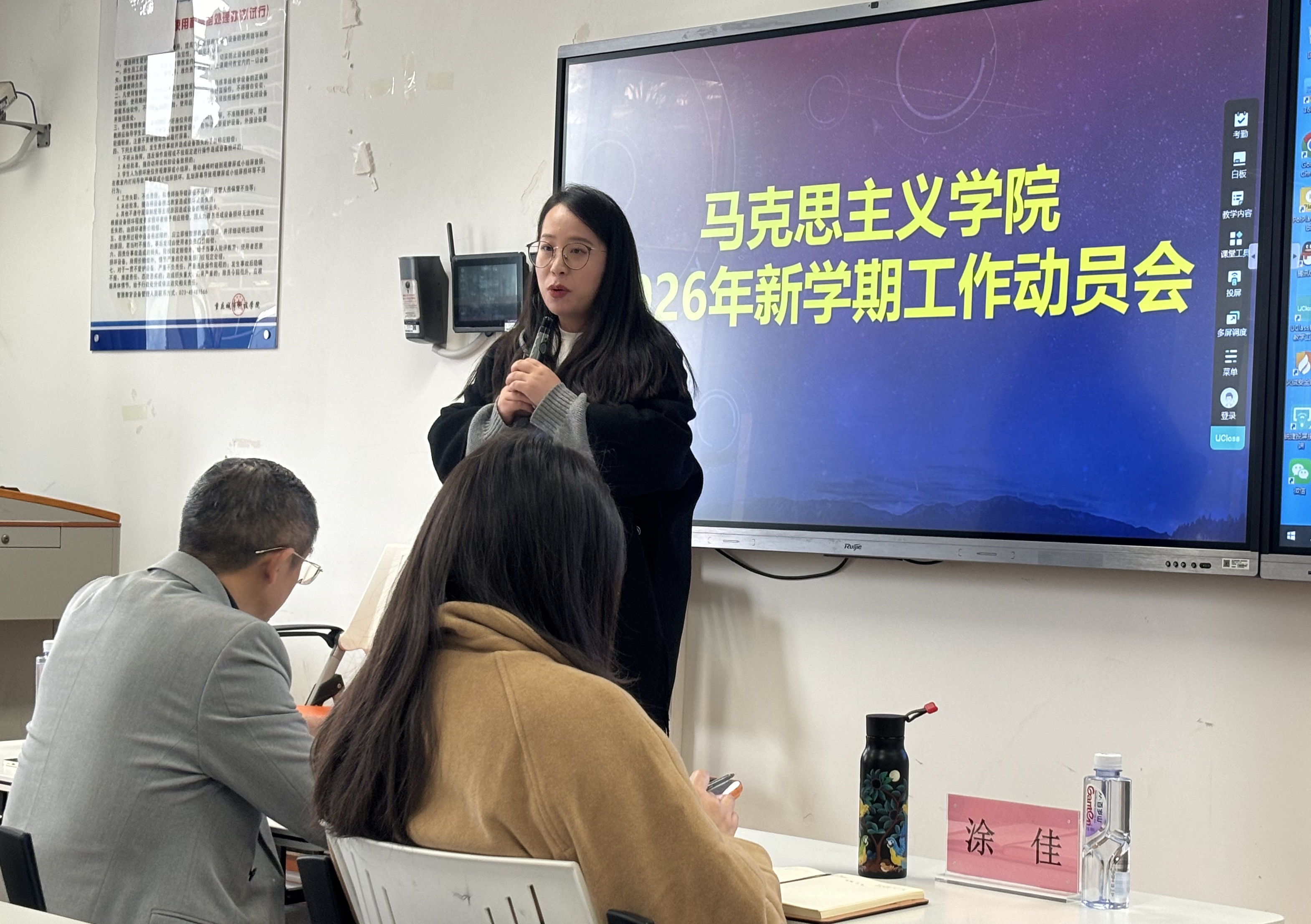 2月26日上午,马克思主义学院在主教206召开2026年新学期工作动员会。学院全体教职工参加了会议,会议由副院长张沙沙主持。 段吉福院长在简要回顾学院2025年工作基础上,对2026学院工作进行了周密部署。他指出,过去一年,学院以“筑基固本谋发展 合楫笃行启新篇”为主题,以习近平新时代中国特色社会主义思想为指导,落实立德树人根本任务,践行“政治建院、人才强院、特色立院、科研兴院”战略,在党建引领、教学质量提升、团队建设、队伍培育、专业建设、学工体系构筑等方面真抓实干,各项事业取得新进展、新成效,为新学期高质量发展奠定坚实基础。2026年学院总体工作思路是:以党建为引领,以教学为中心,以队伍为根本,以专业人才培养为使命,以科研为支撑,以学院文化为纽带,聚焦“队伍年轻化优势转化、公共事务参与度增强、团队凝聚力建设”三大核心任务,统筹推进教学、科研、育人、管理、服务各项工作,全力打造高水平思政队伍,为学校高质量发展提供坚强思想保证和人才支撑。 针对三大核心任务,段院长提出,一是要聚焦队伍年轻化优势转化,激活高质量发展“新动能”,通过搭建成长平台、强化科研赋能、完善激励机制,让青年教师站稳讲台、找准科研方向、增强职业获得感,安心从教、热心从教。二是要聚焦公共事务参与度增强,构建共建共治共享“新格局”,引导教职工树立“院兴我荣、院衰我耻”理念,拓宽参与渠道、突出实效导向,形成人人关心、建设、奉献马院的浓厚氛围。三是要聚焦团队凝聚力建设,打造同心同向同行“战斗集体”,以党建引领聚合力、文化建设润人心、制度规范促协同、关心关爱暖人心,筑牢政治根基、营造家园氛围、健全保障机制、增强情感黏性,凝聚全院发展合力。 2026年是丙午马年,寓意奔腾与进取,更契合马院人铸魂育人、勇毅前行的使命担当。段院长在讲话最后强调,全院教职工要以永不懈怠的精神状态、一往无前的奋斗姿态、求真务实的工作作风,凝心聚力、守正创新、真抓实干、砥砺奋进,奋力谱写马克思主义学院高质量发展新篇章,为学校事业发展、培养担当民族复兴大任的时代新人作出贡献。 (图/文 马克思主义学院 传媒中心 马子微/编辑)
