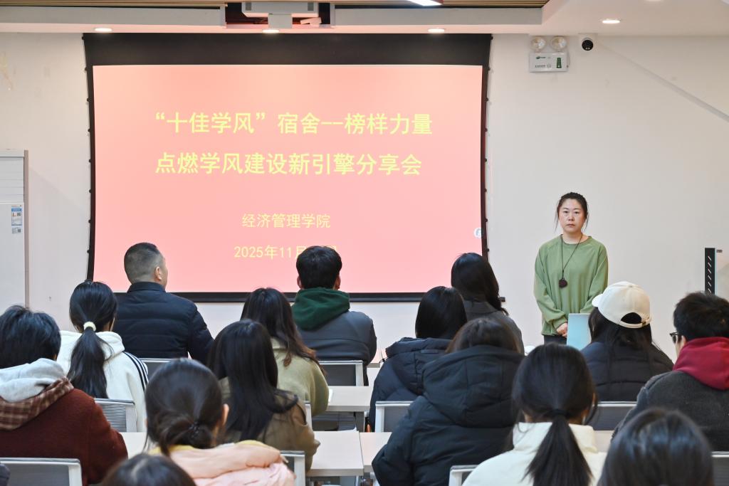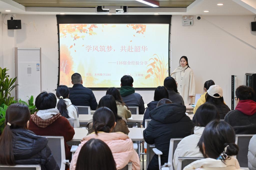 第二环节聚焦“十佳学风”宿舍经验分享,本科数字2301班116宿舍作为学院学风建设的“硬核范本”,带来了鲜活实用的成长秘籍。宿舍成员以“博学笃行、聚力争先”为共同信念,搭建起互助共进的集体成长生态——课堂上同频研学、课后答疑解惑、备考时并肩冲刺,以小组讨论破解难点、用共享笔记梳理重点、靠定期复盘巩固成效,用团结的力量攻克学习难关,用奋斗的汗水浇灌丰硕成果,成为师生公认的“学风标杆”。